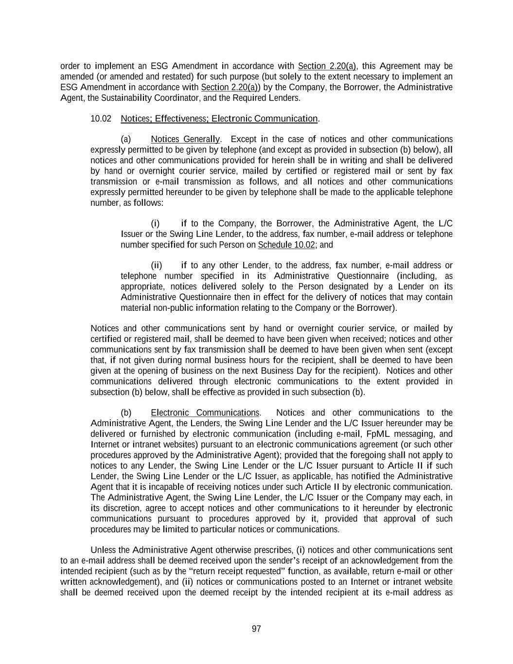 97 order to implement an ESG Amendment in accordance with Section 2.20(a), this Agreement may be amended (or amended and restated) for such purpose (but solely to the extent necessary to implement an ESG Amendment in accordance with Section 2.20(a)) by the Company, the Borrower, the Administrative Agent, the Sustainability Coordinator, and the Required Lenders. 10.02 Notices; Effectiveness; Electronic Communication. (a) Notices Generally. Except in the case of notices and other communications expressly permitted to be given by telephone (and except as provided in subsection (b) below), all notices and other communications provided for herein shall be in writing and shall be delivered by hand or overnight courier service, mailed by certified or registered mail or sent by fax transmission or e-mail transmission as follows, and all notices and other communications expressly permitted hereunder to be given by telephone shall be made to the applicable telephone number, as follows: (i) if to the Company, the Borrower, the Administrative Agent, the L/C Issuer or the Swing Line Lender, to the address, fax number, e-mail address or telephone number specified for such Person on Schedule 10.02; and (ii) if to any other Lender, to the address, fax number, e-mail address or telephone number specified in its Administrative Questionnaire (including, as appropriate, notices delivered solely to the Person designated by a Lender on its Administrative Questionnaire then in effect for the delivery of notices that may contain material non-public information relating to the Company or the Borrower). Notices and other communications sent by hand or overnight courier service, or mailed by certified or registered mail, shall be deemed to have been given when received; notices and other communications sent by fax transmission shall be deemed to have been given when sent (except that, if not given during normal business hours for the recipient, shall be deemed to have been given at the opening of business on the next Business Day for the recipient). Notices and other communications delivered through electronic communications to the extent provided in subsection (b) below, shall be effective as provided in such subsection (b). (b) Electronic Communications. Notices and other communications to the Administrative Agent, the Lenders, the Swing Line Lender and the L/C Issuer hereunder may be delivered or furnished by electronic communication (including e-mail, FpML messaging, and Internet or intranet websites) pursuant to an electronic communications agreement (or such other procedures approved by the Administrative Agent); provided that the foregoing shall not apply to notices to any Lender, the Swing Line Lender or the L/C Issuer pursuant to Article II if such Lender, the Swing Line Lender or the L/C Issuer, as applicable, has notified the Administrative Agent that it is incapable of receiving notices under such Article II by electronic communication. The Administrative Agent, the Swing Line Lender, the L/C Issuer or the Company may each, in its discretion, agree to accept notices and other communications to it hereunder by electronic communications pursuant to procedures approved by it, provided that approval of such procedures may be limited to particular notices or communications. Unless the Administrative Agent otherwise prescribes, (i) notices and other communications sent to an e-mail address shall be deemed received upon the sender’s receipt of an acknowledgement from the intended recipient (such as by the “return receipt requested” function, as available, return e-mail or other written acknowledgement), and (ii) notices or communications posted to an Internet or intranet website shall be deemed received upon the deemed receipt by the intended recipient at its e-mail address as