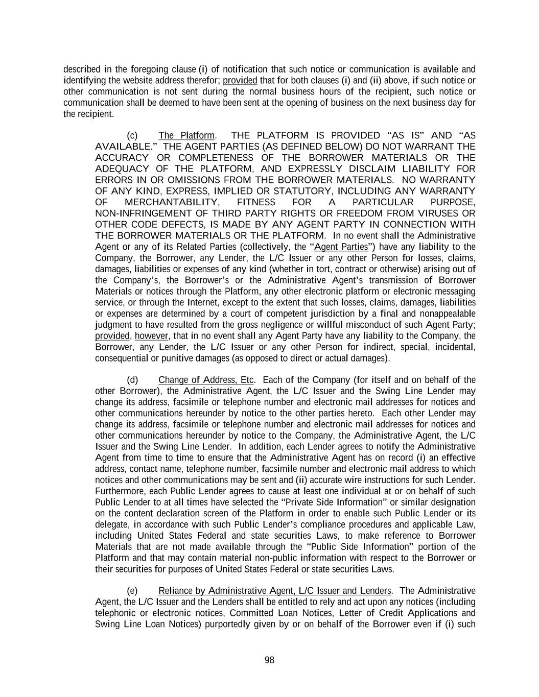 98 described in the foregoing clause (i) of notification that such notice or communication is available and identifying the website address therefor; provided that for both clauses (i) and (ii) above, if such notice or other communication is not sent during the normal business hours of the recipient, such notice or communication shall be deemed to have been sent at the opening of business on the next business day for the recipient. (c) The Platform. THE PLATFORM IS PROVIDED “AS IS” AND “AS AVAILABLE.” THE AGENT PARTIES (AS DEFINED BELOW) DO NOT WARRANT THE ACCURACY OR COMPLETENESS OF THE BORROWER MATERIALS OR THE ADEQUACY OF THE PLATFORM, AND EXPRESSLY DISCLAIM LIABILITY FOR ERRORS IN OR OMISSIONS FROM THE BORROWER MATERIALS. NO WARRANTY OF ANY KIND, EXPRESS, IMPLIED OR STATUTORY, INCLUDING ANY WARRANTY OF MERCHANTABILITY, FITNESS FOR A PARTICULAR PURPOSE, NON-INFRINGEMENT OF THIRD PARTY RIGHTS OR FREEDOM FROM VIRUSES OR OTHER CODE DEFECTS, IS MADE BY ANY AGENT PARTY IN CONNECTION WITH THE BORROWER MATERIALS OR THE PLATFORM. In no event shall the Administrative Agent or any of its Related Parties (collectively, the “Agent Parties”) have any liability to the Company, the Borrower, any Lender, the L/C Issuer or any other Person for losses, claims, damages, liabilities or expenses of any kind (whether in tort, contract or otherwise) arising out of the Company’s, the Borrower’s or the Administrative Agent’s transmission of Borrower Materials or notices through the Platform, any other electronic platform or electronic messaging service, or through the Internet, except to the extent that such losses, claims, damages, liabilities or expenses are determined by a court of competent jurisdiction by a final and nonappealable judgment to have resulted from the gross negligence or willful misconduct of such Agent Party; provided, however, that in no event shall any Agent Party have any liability to the Company, the Borrower, any Lender, the L/C Issuer or any other Person for indirect, special, incidental, consequential or punitive damages (as opposed to direct or actual damages). (d) Change of Address, Etc. Each of the Company (for itself and on behalf of the other Borrower), the Administrative Agent, the L/C Issuer and the Swing Line Lender may change its address, facsimile or telephone number and electronic mail addresses for notices and other communications hereunder by notice to the other parties hereto. Each other Lender may change its address, facsimile or telephone number and electronic mail addresses for notices and other communications hereunder by notice to the Company, the Administrative Agent, the L/C Issuer and the Swing Line Lender. In addition, each Lender agrees to notify the Administrative Agent from time to time to ensure that the Administrative Agent has on record (i) an effective address, contact name, telephone number, facsimile number and electronic mail address to which notices and other communications may be sent and (ii) accurate wire instructions for such Lender. Furthermore, each Public Lender agrees to cause at least one individual at or on behalf of such Public Lender to at all times have selected the “Private Side Information” or similar designation on the content declaration screen of the Platform in order to enable such Public Lender or its delegate, in accordance with such Public Lender’s compliance procedures and applicable Law, including United States Federal and state securities Laws, to make reference to Borrower Materials that are not made available through the “Public Side Information” portion of the Platform and that may contain material non-public information with respect to the Borrower or their securities for purposes of United States Federal or state securities Laws. (e) Reliance by Administrative Agent, L/C Issuer and Lenders. The Administrative Agent, the L/C Issuer and the Lenders shall be entitled to rely and act upon any notices (including telephonic or electronic notices, Committed Loan Notices, Letter of Credit Applications and Swing Line Loan Notices) purportedly given by or on behalf of the Borrower even if (i) such