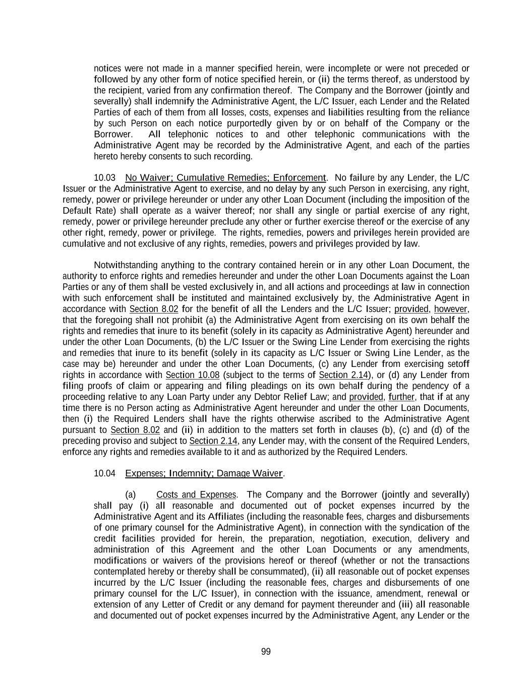 99 notices were not made in a manner specified herein, were incomplete or were not preceded or followed by any other form of notice specified herein, or (ii) the terms thereof, as understood by the recipient, varied from any confirmation thereof. The Company and the Borrower (jointly and severally) shall indemnify the Administrative Agent, the L/C Issuer, each Lender and the Related Parties of each of them from all losses, costs, expenses and liabilities resulting from the reliance by such Person on each notice purportedly given by or on behalf of the Company or the Borrower. All telephonic notices to and other telephonic communications with the Administrative Agent may be recorded by the Administrative Agent, and each of the parties hereto hereby consents to such recording. 10.03 No Waiver; Cumulative Remedies; Enforcement. No failure by any Lender, the L/C Issuer or the Administrative Agent to exercise, and no delay by any such Person in exercising, any right, remedy, power or privilege hereunder or under any other Loan Document (including the imposition of the Default Rate) shall operate as a waiver thereof; nor shall any single or partial exercise of any right, remedy, power or privilege hereunder preclude any other or further exercise thereof or the exercise of any other right, remedy, power or privilege. The rights, remedies, powers and privileges herein provided are cumulative and not exclusive of any rights, remedies, powers and privileges provided by law. Notwithstanding anything to the contrary contained herein or in any other Loan Document, the authority to enforce rights and remedies hereunder and under the other Loan Documents against the Loan Parties or any of them shall be vested exclusively in, and all actions and proceedings at law in connection with such enforcement shall be instituted and maintained exclusively by, the Administrative Agent in accordance with Section 8.02 for the benefit of all the Lenders and the L/C Issuer; provided, however, that the foregoing shall not prohibit (a) the Administrative Agent from exercising on its own behalf the rights and remedies that inure to its benefit (solely in its capacity as Administrative Agent) hereunder and under the other Loan Documents, (b) the L/C Issuer or the Swing Line Lender from exercising the rights and remedies that inure to its benefit (solely in its capacity as L/C Issuer or Swing Line Lender, as the case may be) hereunder and under the other Loan Documents, (c) any Lender from exercising setoff rights in accordance with Section 10.08 (subject to the terms of Section 2.14), or (d) any Lender from filing proofs of claim or appearing and filing pleadings on its own behalf during the pendency of a proceeding relative to any Loan Party under any Debtor Relief Law; and provided, further, that if at any time there is no Person acting as Administrative Agent hereunder and under the other Loan Documents, then (i) the Required Lenders shall have the rights otherwise ascribed to the Administrative Agent pursuant to Section 8.02 and (ii) in addition to the matters set forth in clauses (b), (c) and (d) of the preceding proviso and subject to Section 2.14, any Lender may, with the consent of the Required Lenders, enforce any rights and remedies available to it and as authorized by the Required Lenders. 10.04 Expenses; Indemnity; Damage Waiver. (a) Costs and Expenses. The Company and the Borrower (jointly and severally) shall pay (i) all reasonable and documented out of pocket expenses incurred by the Administrative Agent and its Affiliates (including the reasonable fees, charges and disbursements of one primary counsel for the Administrative Agent), in connection with the syndication of the credit facilities provided for herein, the preparation, negotiation, execution, delivery and administration of this Agreement and the other Loan Documents or any amendments, modifications or waivers of the provisions hereof or thereof (whether or not the transactions contemplated hereby or thereby shall be consummated), (ii) all reasonable out of pocket expenses incurred by the L/C Issuer (including the reasonable fees, charges and disbursements of one primary counsel for the L/C Issuer), in connection with the issuance, amendment, renewal or extension of any Letter of Credit or any demand for payment thereunder and (iii) all reasonable and documented out of pocket expenses incurred by the Administrative Agent, any Lender or the