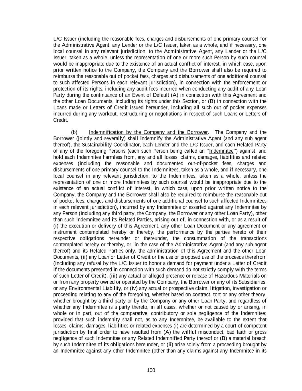100 L/C Issuer (including the reasonable fees, charges and disbursements of one primary counsel for the Administrative Agent, any Lender or the L/C Issuer, taken as a whole, and if necessary, one local counsel in any relevant jurisdiction, to the Administrative Agent, any Lender or the L/C Issuer, taken as a whole, unless the representation of one or more such Person by such counsel would be inappropriate due to the existence of an actual conflict of interest, in which case, upon prior written notice to the Company, the Company and the Borrower shall also be required to reimburse the reasonable out of pocket fees, charges and disbursements of one additional counsel to such affected Persons in each relevant jurisdiction), in connection with the enforcement or protection of its rights, including any audit fees incurred when conducting any audit of any Loan Party during the continuance of an Event of Default (A) in connection with this Agreement and the other Loan Documents, including its rights under this Section, or (B) in connection with the Loans made or Letters of Credit issued hereunder, including all such out of pocket expenses incurred during any workout, restructuring or negotiations in respect of such Loans or Letters of Credit. (b) Indemnification by the Company and the Borrower. The Company and the Borrower (jointly and severally) shall indemnify the Administrative Agent (and any sub agent thereof), the Sustainability Coordinator, each Lender and the L/C Issuer, and each Related Party of any of the foregoing Persons (each such Person being called an “Indemnitee”) against, and hold each Indemnitee harmless from, any and all losses, claims, damages, liabilities and related expenses (including the reasonable and documented out-of-pocket fees, charges and disbursements of one primary counsel to the Indemnitees, taken as a whole, and if necessary, one local counsel in any relevant jurisdiction, to the Indemnitees, taken as a whole, unless the representation of one or more Indemnitees by such counsel would be inappropriate due to the existence of an actual conflict of interest, in which case, upon prior written notice to the Company, the Company and the Borrower shall also be required to reimburse the reasonable out of pocket fees, charges and disbursements of one additional counsel to such affected Indemnitees in each relevant jurisdiction), incurred by any Indemnitee or asserted against any Indemnitee by any Person (including any third party, the Company, the Borrower or any other Loan Party), other than such Indemnitee and its Related Parties, arising out of, in connection with, or as a result of (i) the execution or delivery of this Agreement, any other Loan Document or any agreement or instrument contemplated hereby or thereby, the performance by the parties hereto of their respective obligations hereunder or thereunder, the consummation of the transactions contemplated hereby or thereby, or, in the case of the Administrative Agent (and any sub agent thereof) and its Related Parties only, the administration of this Agreement and the other Loan Documents, (ii) any Loan or Letter of Credit or the use or proposed use of the proceeds therefrom (including any refusal by the L/C Issuer to honor a demand for payment under a Letter of Credit if the documents presented in connection with such demand do not strictly comply with the terms of such Letter of Credit), (iii) any actual or alleged presence or release of Hazardous Materials on or from any property owned or operated by the Company, the Borrower or any of its Subsidiaries, or any Environmental Liability, or (iv) any actual or prospective claim, litigation, investigation or proceeding relating to any of the foregoing, whether based on contract, tort or any other theory, whether brought by a third party or by the Company or any other Loan Party, and regardless of whether any Indemnitee is a party thereto, in all cases, whether or not caused by or arising, in whole or in part, out of the comparative, contributory or sole negligence of the Indemnitee; provided that such indemnity shall not, as to any Indemnitee, be available to the extent that losses, claims, damages, liabilities or related expenses (i) are determined by a court of competent jurisdiction by final order to have resulted from (A) the willful misconduct, bad faith or gross negligence of such Indemnitee or any Related Indemnified Party thereof or (B) a material breach by such Indemnitee of its obligations hereunder, or (ii) arise solely from a proceeding brought by an Indemnitee against any other Indemnitee (other than any claims against any Indemnitee in its