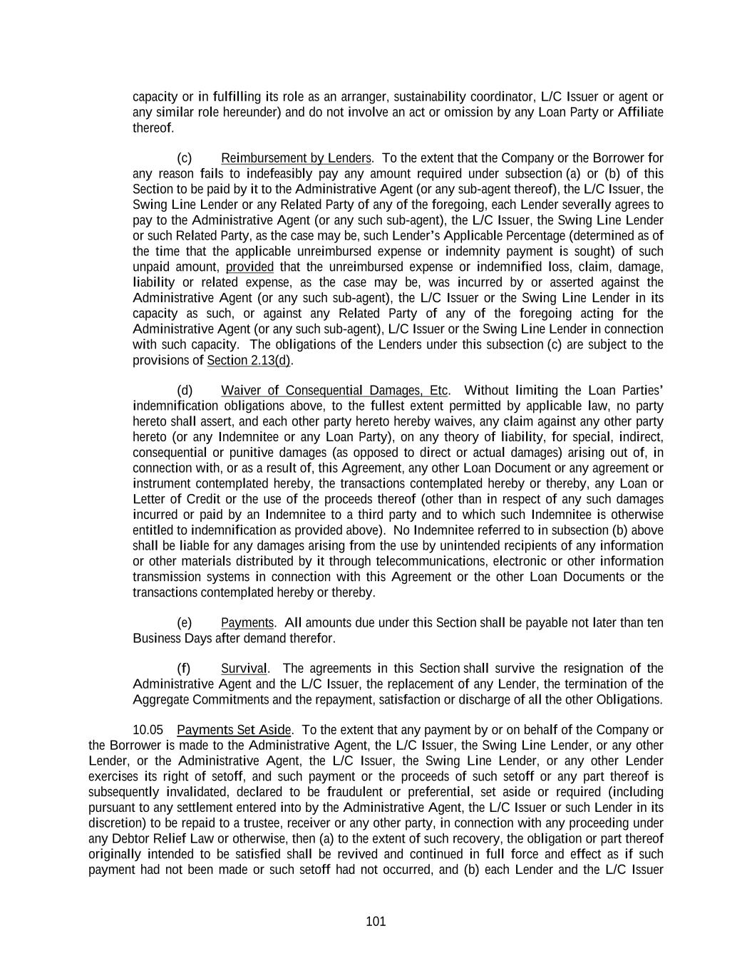 101 capacity or in fulfilling its role as an arranger, sustainability coordinator, L/C Issuer or agent or any similar role hereunder) and do not involve an act or omission by any Loan Party or Affiliate thereof. (c) Reimbursement by Lenders. To the extent that the Company or the Borrower for any reason fails to indefeasibly pay any amount required under subsection (a) or (b) of this Section to be paid by it to the Administrative Agent (or any sub-agent thereof), the L/C Issuer, the Swing Line Lender or any Related Party of any of the foregoing, each Lender severally agrees to pay to the Administrative Agent (or any such sub-agent), the L/C Issuer, the Swing Line Lender or such Related Party, as the case may be, such Lender’s Applicable Percentage (determined as of the time that the applicable unreimbursed expense or indemnity payment is sought) of such unpaid amount, provided that the unreimbursed expense or indemnified loss, claim, damage, liability or related expense, as the case may be, was incurred by or asserted against the Administrative Agent (or any such sub-agent), the L/C Issuer or the Swing Line Lender in its capacity as such, or against any Related Party of any of the foregoing acting for the Administrative Agent (or any such sub-agent), L/C Issuer or the Swing Line Lender in connection with such capacity. The obligations of the Lenders under this subsection (c) are subject to the provisions of Section 2.13(d). (d) Waiver of Consequential Damages, Etc. Without limiting the Loan Parties’ indemnification obligations above, to the fullest extent permitted by applicable law, no party hereto shall assert, and each other party hereto hereby waives, any claim against any other party hereto (or any Indemnitee or any Loan Party), on any theory of liability, for special, indirect, consequential or punitive damages (as opposed to direct or actual damages) arising out of, in connection with, or as a result of, this Agreement, any other Loan Document or any agreement or instrument contemplated hereby, the transactions contemplated hereby or thereby, any Loan or Letter of Credit or the use of the proceeds thereof (other than in respect of any such damages incurred or paid by an Indemnitee to a third party and to which such Indemnitee is otherwise entitled to indemnification as provided above). No Indemnitee referred to in subsection (b) above shall be liable for any damages arising from the use by unintended recipients of any information or other materials distributed by it through telecommunications, electronic or other information transmission systems in connection with this Agreement or the other Loan Documents or the transactions contemplated hereby or thereby. (e) Payments. All amounts due under this Section shall be payable not later than ten Business Days after demand therefor. (f) Survival. The agreements in this Section shall survive the resignation of the Administrative Agent and the L/C Issuer, the replacement of any Lender, the termination of the Aggregate Commitments and the repayment, satisfaction or discharge of all the other Obligations. 10.05 Payments Set Aside. To the extent that any payment by or on behalf of the Company or the Borrower is made to the Administrative Agent, the L/C Issuer, the Swing Line Lender, or any other Lender, or the Administrative Agent, the L/C Issuer, the Swing Line Lender, or any other Lender exercises its right of setoff, and such payment or the proceeds of such setoff or any part thereof is subsequently invalidated, declared to be fraudulent or preferential, set aside or required (including pursuant to any settlement entered into by the Administrative Agent, the L/C Issuer or such Lender in its discretion) to be repaid to a trustee, receiver or any other party, in connection with any proceeding under any Debtor Relief Law or otherwise, then (a) to the extent of such recovery, the obligation or part thereof originally intended to be satisfied shall be revived and continued in full force and effect as if such payment had not been made or such setoff had not occurred, and (b) each Lender and the L/C Issuer