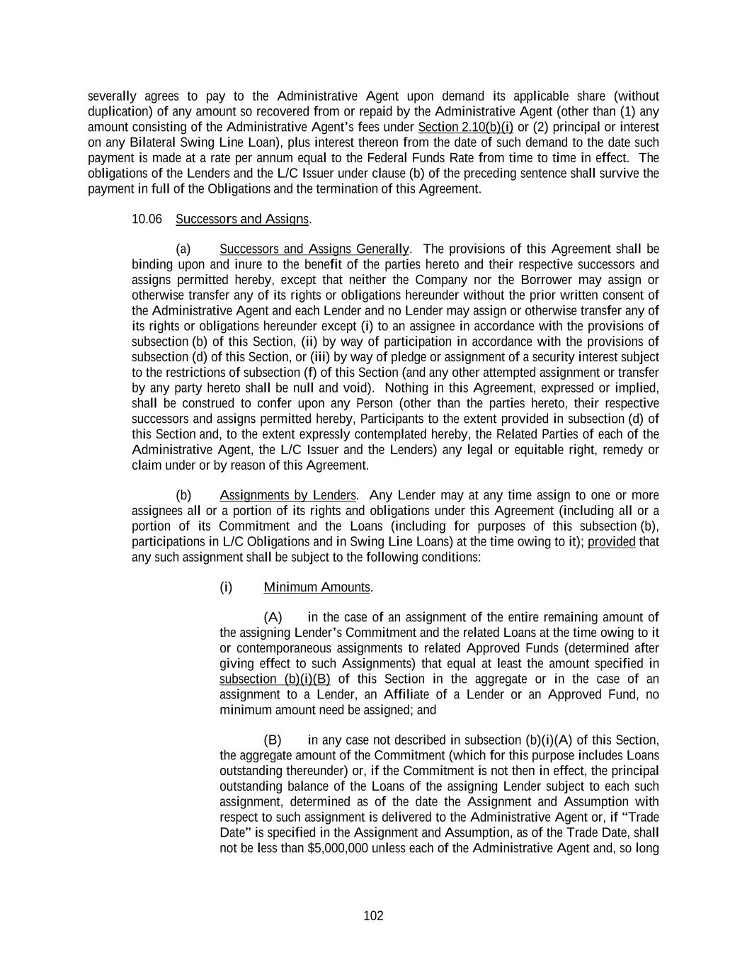 102 severally agrees to pay to the Administrative Agent upon demand its applicable share (without duplication) of any amount so recovered from or repaid by the Administrative Agent (other than (1) any amount consisting of the Administrative Agent’s fees under Section 2.10(b)(i) or (2) principal or interest on any Bilateral Swing Line Loan), plus interest thereon from the date of such demand to the date such payment is made at a rate per annum equal to the Federal Funds Rate from time to time in effect. The obligations of the Lenders and the L/C Issuer under clause (b) of the preceding sentence shall survive the payment in full of the Obligations and the termination of this Agreement. 10.06 Successors and Assigns. (a) Successors and Assigns Generally. The provisions of this Agreement shall be binding upon and inure to the benefit of the parties hereto and their respective successors and assigns permitted hereby, except that neither the Company nor the Borrower may assign or otherwise transfer any of its rights or obligations hereunder without the prior written consent of the Administrative Agent and each Lender and no Lender may assign or otherwise transfer any of its rights or obligations hereunder except (i) to an assignee in accordance with the provisions of subsection (b) of this Section, (ii) by way of participation in accordance with the provisions of subsection (d) of this Section, or (iii) by way of pledge or assignment of a security interest subject to the restrictions of subsection (f) of this Section (and any other attempted assignment or transfer by any party hereto shall be null and void). Nothing in this Agreement, expressed or implied, shall be construed to confer upon any Person (other than the parties hereto, their respective successors and assigns permitted hereby, Participants to the extent provided in subsection (d) of this Section and, to the extent expressly contemplated hereby, the Related Parties of each of the Administrative Agent, the L/C Issuer and the Lenders) any legal or equitable right, remedy or claim under or by reason of this Agreement. (b) Assignments by Lenders. Any Lender may at any time assign to one or more assignees all or a portion of its rights and obligations under this Agreement (including all or a portion of its Commitment and the Loans (including for purposes of this subsection (b), participations in L/C Obligations and in Swing Line Loans) at the time owing to it); provided that any such assignment shall be subject to the following conditions: (i) Minimum Amounts. (A) in the case of an assignment of the entire remaining amount of the assigning Lender’s Commitment and the related Loans at the time owing to it or contemporaneous assignments to related Approved Funds (determined after giving effect to such Assignments) that equal at least the amount specified in subsection (b)(i)(B) of this Section in the aggregate or in the case of an assignment to a Lender, an Affiliate of a Lender or an Approved Fund, no minimum amount need be assigned; and (B) in any case not described in subsection (b)(i)(A) of this Section, the aggregate amount of the Commitment (which for this purpose includes Loans outstanding thereunder) or, if the Commitment is not then in effect, the principal outstanding balance of the Loans of the assigning Lender subject to each such assignment, determined as of the date the Assignment and Assumption with respect to such assignment is delivered to the Administrative Agent or, if “Trade Date” is specified in the Assignment and Assumption, as of the Trade Date, shall not be less than $5,000,000 unless each of the Administrative Agent and, so long