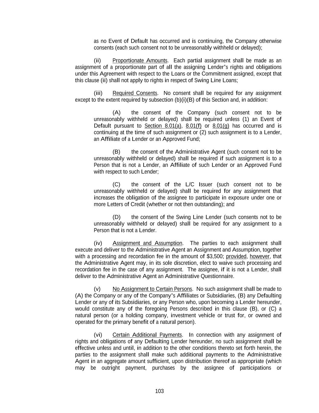 103 as no Event of Default has occurred and is continuing, the Company otherwise consents (each such consent not to be unreasonably withheld or delayed); (ii) Proportionate Amounts. Each partial assignment shall be made as an assignment of a proportionate part of all the assigning Lender’s rights and obligations under this Agreement with respect to the Loans or the Commitment assigned, except that this clause (ii) shall not apply to rights in respect of Swing Line Loans; (iii) Required Consents. No consent shall be required for any assignment except to the extent required by subsection (b)(i)(B) of this Section and, in addition: (A) the consent of the Company (such consent not to be unreasonably withheld or delayed) shall be required unless (1) an Event of Default pursuant to Section 8.01(a), 8.01(f) or 8.01(g) has occurred and is continuing at the time of such assignment or (2) such assignment is to a Lender, an Affiliate of a Lender or an Approved Fund; (B) the consent of the Administrative Agent (such consent not to be unreasonably withheld or delayed) shall be required if such assignment is to a Person that is not a Lender, an Affiliate of such Lender or an Approved Fund with respect to such Lender; (C) the consent of the L/C Issuer (such consent not to be unreasonably withheld or delayed) shall be required for any assignment that increases the obligation of the assignee to participate in exposure under one or more Letters of Credit (whether or not then outstanding); and (D) the consent of the Swing Line Lender (such consents not to be unreasonably withheld or delayed) shall be required for any assignment to a Person that is not a Lender. (iv) Assignment and Assumption. The parties to each assignment shall execute and deliver to the Administrative Agent an Assignment and Assumption, together with a processing and recordation fee in the amount of $3,500; provided, however, that the Administrative Agent may, in its sole discretion, elect to waive such processing and recordation fee in the case of any assignment. The assignee, if it is not a Lender, shall deliver to the Administrative Agent an Administrative Questionnaire. (v) No Assignment to Certain Persons. No such assignment shall be made to (A) the Company or any of the Company’s Affiliates or Subsidiaries, (B) any Defaulting Lender or any of its Subsidiaries, or any Person who, upon becoming a Lender hereunder, would constitute any of the foregoing Persons described in this clause (B), or (C) a natural person (or a holding company, investment vehicle or trust for, or owned and operated for the primary benefit of a natural person). (vi) Certain Additional Payments. In connection with any assignment of rights and obligations of any Defaulting Lender hereunder, no such assignment shall be effective unless and until, in addition to the other conditions thereto set forth herein, the parties to the assignment shall make such additional payments to the Administrative Agent in an aggregate amount sufficient, upon distribution thereof as appropriate (which may be outright payment, purchases by the assignee of participations or