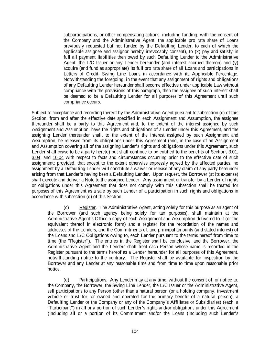 104 subparticipations, or other compensating actions, including funding, with the consent of the Company and the Administrative Agent, the applicable pro rata share of Loans previously requested but not funded by the Defaulting Lender, to each of which the applicable assignee and assignor hereby irrevocably consent), to (x) pay and satisfy in full all payment liabilities then owed by such Defaulting Lender to the Administrative Agent, the L/C Issuer or any Lender hereunder (and interest accrued thereon) and (y) acquire (and fund as appropriate) its full pro rata share of all Loans and participations in Letters of Credit, Swing Line Loans in accordance with its Applicable Percentage. Notwithstanding the foregoing, in the event that any assignment of rights and obligations of any Defaulting Lender hereunder shall become effective under applicable Law without compliance with the provisions of this paragraph, then the assignee of such interest shall be deemed to be a Defaulting Lender for all purposes of this Agreement until such compliance occurs. Subject to acceptance and recording thereof by the Administrative Agent pursuant to subsection (c) of this Section, from and after the effective date specified in each Assignment and Assumption, the assignee thereunder shall be a party to this Agreement and, to the extent of the interest assigned by such Assignment and Assumption, have the rights and obligations of a Lender under this Agreement, and the assigning Lender thereunder shall, to the extent of the interest assigned by such Assignment and Assumption, be released from its obligations under this Agreement (and, in the case of an Assignment and Assumption covering all of the assigning Lender’s rights and obligations under this Agreement, such Lender shall cease to be a party hereto) but shall continue to be entitled to the benefits of Sections 3.01, 3.04, and 10.04 with respect to facts and circumstances occurring prior to the effective date of such assignment; provided, that except to the extent otherwise expressly agreed by the affected parties, no assignment by a Defaulting Lender will constitute a waiver or release of any claim of any party hereunder arising from that Lender’s having been a Defaulting Lender. Upon request, the Borrower (at its expense) shall execute and deliver a Note to the assignee Lender. Any assignment or transfer by a Lender of rights or obligations under this Agreement that does not comply with this subsection shall be treated for purposes of this Agreement as a sale by such Lender of a participation in such rights and obligations in accordance with subsection (d) of this Section. (c) Register. The Administrative Agent, acting solely for this purpose as an agent of the Borrower (and such agency being solely for tax purposes), shall maintain at the Administrative Agent’s Office a copy of each Assignment and Assumption delivered to it (or the equivalent thereof in electronic form) and a register for the recordation of the names and addresses of the Lenders, and the Commitments of, and principal amounts (and stated interest) of the Loans and L/C Obligations owing to, each Lender pursuant to the terms hereof from time to time (the “Register”). The entries in the Register shall be conclusive, and the Borrower, the Administrative Agent and the Lenders shall treat each Person whose name is recorded in the Register pursuant to the terms hereof as a Lender hereunder for all purposes of this Agreement, notwithstanding notice to the contrary. The Register shall be available for inspection by the Borrower and any Lender at any reasonable time and from time to time upon reasonable prior notice. (d) Participations. Any Lender may at any time, without the consent of, or notice to, the Company, the Borrower, the Swing Line Lender, the L/C Issuer or the Administrative Agent, sell participations to any Person (other than a natural person (or a holding company, investment vehicle or trust for, or owned and operated for the primary benefit of a natural person), a Defaulting Lender or the Company or any of the Company’s Affiliates or Subsidiaries) (each, a “Participant”) in all or a portion of such Lender’s rights and/or obligations under this Agreement (including all or a portion of its Commitment and/or the Loans (including such Lender’s