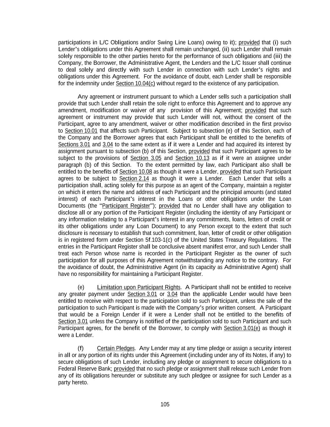 105 participations in L/C Obligations and/or Swing Line Loans) owing to it); provided that (i) such Lender’s obligations under this Agreement shall remain unchanged, (ii) such Lender shall remain solely responsible to the other parties hereto for the performance of such obligations and (iii) the Company, the Borrower, the Administrative Agent, the Lenders and the L/C Issuer shall continue to deal solely and directly with such Lender in connection with such Lender’s rights and obligations under this Agreement. For the avoidance of doubt, each Lender shall be responsible for the indemnity under Section 10.04(c) without regard to the existence of any participation. Any agreement or instrument pursuant to which a Lender sells such a participation shall provide that such Lender shall retain the sole right to enforce this Agreement and to approve any amendment, modification or waiver of any provision of this Agreement; provided that such agreement or instrument may provide that such Lender will not, without the consent of the Participant, agree to any amendment, waiver or other modification described in the first proviso to Section 10.01 that affects such Participant. Subject to subsection (e) of this Section, each of the Company and the Borrower agrees that each Participant shall be entitled to the benefits of Sections 3.01 and 3.04 to the same extent as if it were a Lender and had acquired its interest by assignment pursuant to subsection (b) of this Section, provided that such Participant agrees to be subject to the provisions of Section 3.05 and Section 10.13 as if it were an assignee under paragraph (b) of this Section. To the extent permitted by law, each Participant also shall be entitled to the benefits of Section 10.08 as though it were a Lender, provided that such Participant agrees to be subject to Section 2.14 as though it were a Lender. Each Lender that sells a participation shall, acting solely for this purpose as an agent of the Company, maintain a register on which it enters the name and address of each Participant and the principal amounts (and stated interest) of each Participant’s interest in the Loans or other obligations under the Loan Documents (the “Participant Register”); provided that no Lender shall have any obligation to disclose all or any portion of the Participant Register (including the identity of any Participant or any information relating to a Participant’s interest in any commitments, loans, letters of credit or its other obligations under any Loan Document) to any Person except to the extent that such disclosure is necessary to establish that such commitment, loan, letter of credit or other obligation is in registered form under Section 5f.103-1(c) of the United States Treasury Regulations. The entries in the Participant Register shall be conclusive absent manifest error, and such Lender shall treat each Person whose name is recorded in the Participant Register as the owner of such participation for all purposes of this Agreement notwithstanding any notice to the contrary. For the avoidance of doubt, the Administrative Agent (in its capacity as Administrative Agent) shall have no responsibility for maintaining a Participant Register. (e) Limitation upon Participant Rights. A Participant shall not be entitled to receive any greater payment under Section 3.01 or 3.04 than the applicable Lender would have been entitled to receive with respect to the participation sold to such Participant, unless the sale of the participation to such Participant is made with the Company’s prior written consent. A Participant that would be a Foreign Lender if it were a Lender shall not be entitled to the benefits of Section 3.01 unless the Company is notified of the participation sold to such Participant and such Participant agrees, for the benefit of the Borrower, to comply with Section 3.01(e) as though it were a Lender. (f) Certain Pledges. Any Lender may at any time pledge or assign a security interest in all or any portion of its rights under this Agreement (including under any of its Notes, if any) to secure obligations of such Lender, including any pledge or assignment to secure obligations to a Federal Reserve Bank; provided that no such pledge or assignment shall release such Lender from any of its obligations hereunder or substitute any such pledgee or assignee for such Lender as a party hereto.
