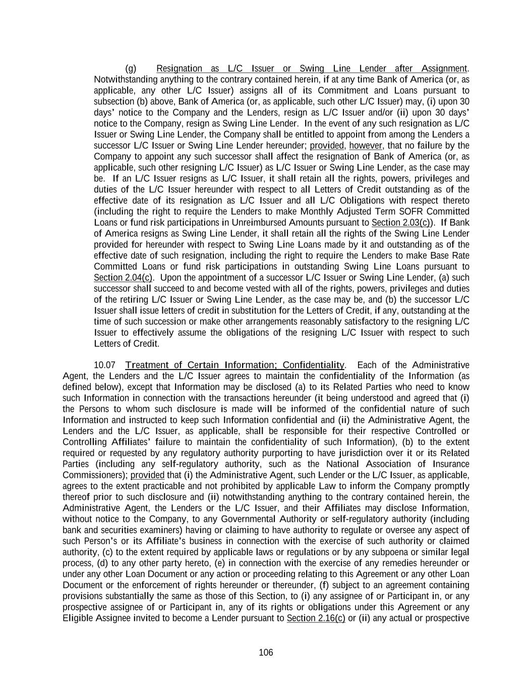 106 (g) Resignation as L/C Issuer or Swing Line Lender after Assignment. Notwithstanding anything to the contrary contained herein, if at any time Bank of America (or, as applicable, any other L/C Issuer) assigns all of its Commitment and Loans pursuant to subsection (b) above, Bank of America (or, as applicable, such other L/C Issuer) may, (i) upon 30 days’ notice to the Company and the Lenders, resign as L/C Issuer and/or (ii) upon 30 days’ notice to the Company, resign as Swing Line Lender. In the event of any such resignation as L/C Issuer or Swing Line Lender, the Company shall be entitled to appoint from among the Lenders a successor L/C Issuer or Swing Line Lender hereunder; provided, however, that no failure by the Company to appoint any such successor shall affect the resignation of Bank of America (or, as applicable, such other resigning L/C Issuer) as L/C Issuer or Swing Line Lender, as the case may be. If an L/C Issuer resigns as L/C Issuer, it shall retain all the rights, powers, privileges and duties of the L/C Issuer hereunder with respect to all Letters of Credit outstanding as of the effective date of its resignation as L/C Issuer and all L/C Obligations with respect thereto (including the right to require the Lenders to make Monthly Adjusted Term SOFR Committed Loans or fund risk participations in Unreimbursed Amounts pursuant to Section 2.03(c)). If Bank of America resigns as Swing Line Lender, it shall retain all the rights of the Swing Line Lender provided for hereunder with respect to Swing Line Loans made by it and outstanding as of the effective date of such resignation, including the right to require the Lenders to make Base Rate Committed Loans or fund risk participations in outstanding Swing Line Loans pursuant to Section 2.04(c). Upon the appointment of a successor L/C Issuer or Swing Line Lender, (a) such successor shall succeed to and become vested with all of the rights, powers, privileges and duties of the retiring L/C Issuer or Swing Line Lender, as the case may be, and (b) the successor L/C Issuer shall issue letters of credit in substitution for the Letters of Credit, if any, outstanding at the time of such succession or make other arrangements reasonably satisfactory to the resigning L/C Issuer to effectively assume the obligations of the resigning L/C Issuer with respect to such Letters of Credit. 10.07 Treatment of Certain Information; Confidentiality. Each of the Administrative Agent, the Lenders and the L/C Issuer agrees to maintain the confidentiality of the Information (as defined below), except that Information may be disclosed (a) to its Related Parties who need to know such Information in connection with the transactions hereunder (it being understood and agreed that (i) the Persons to whom such disclosure is made will be informed of the confidential nature of such Information and instructed to keep such Information confidential and (ii) the Administrative Agent, the Lenders and the L/C Issuer, as applicable, shall be responsible for their respective Controlled or Controlling Affiliates’ failure to maintain the confidentiality of such Information), (b) to the extent required or requested by any regulatory authority purporting to have jurisdiction over it or its Related Parties (including any self-regulatory authority, such as the National Association of Insurance Commissioners); provided that (i) the Administrative Agent, such Lender or the L/C Issuer, as applicable, agrees to the extent practicable and not prohibited by applicable Law to inform the Company promptly thereof prior to such disclosure and (ii) notwithstanding anything to the contrary contained herein, the Administrative Agent, the Lenders or the L/C Issuer, and their Affiliates may disclose Information, without notice to the Company, to any Governmental Authority or self-regulatory authority (including bank and securities examiners) having or claiming to have authority to regulate or oversee any aspect of such Person’s or its Affiliate’s business in connection with the exercise of such authority or claimed authority, (c) to the extent required by applicable laws or regulations or by any subpoena or similar legal process, (d) to any other party hereto, (e) in connection with the exercise of any remedies hereunder or under any other Loan Document or any action or proceeding relating to this Agreement or any other Loan Document or the enforcement of rights hereunder or thereunder, (f) subject to an agreement containing provisions substantially the same as those of this Section, to (i) any assignee of or Participant in, or any prospective assignee of or Participant in, any of its rights or obligations under this Agreement or any Eligible Assignee invited to become a Lender pursuant to Section 2.16(c) or (ii) any actual or prospective