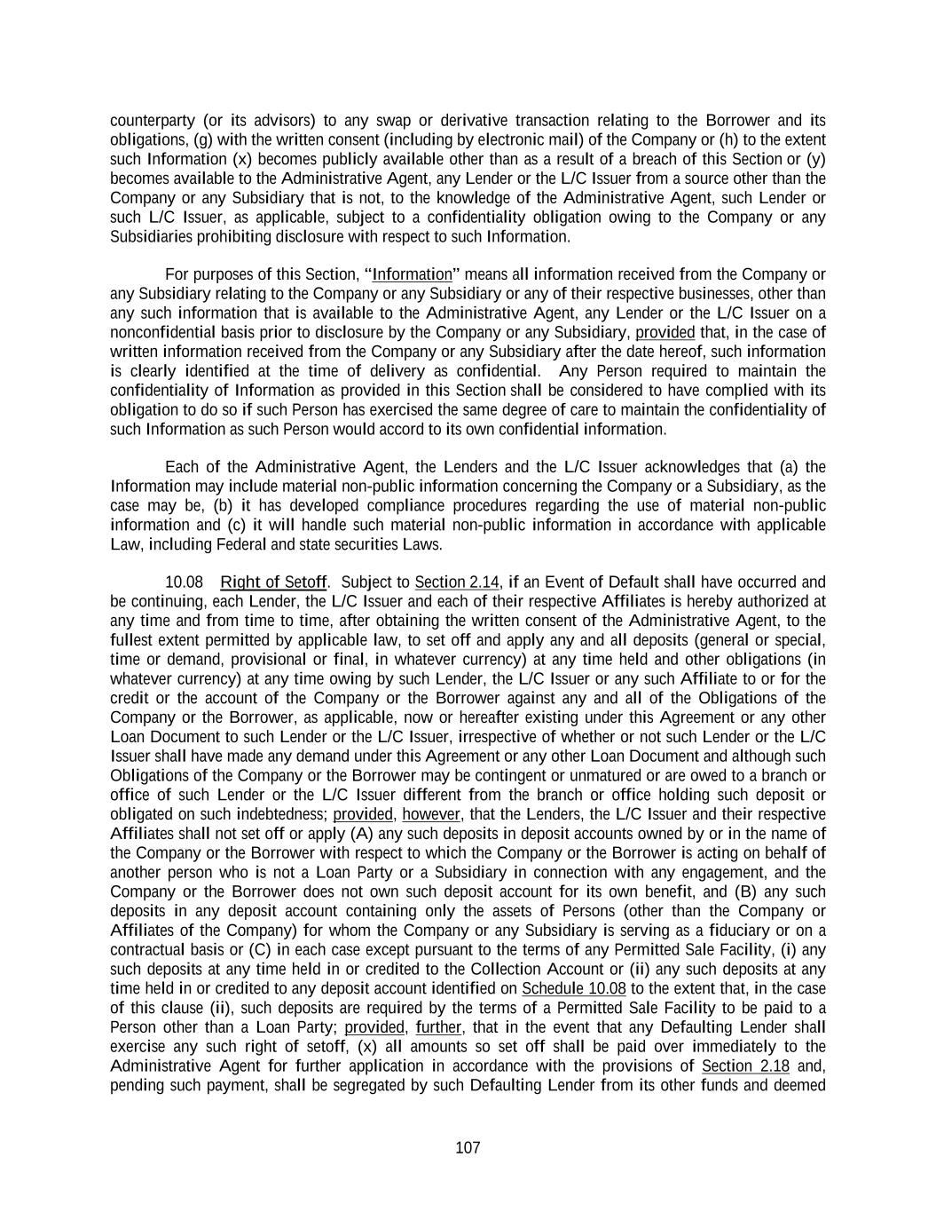 107 counterparty (or its advisors) to any swap or derivative transaction relating to the Borrower and its obligations, (g) with the written consent (including by electronic mail) of the Company or (h) to the extent such Information (x) becomes publicly available other than as a result of a breach of this Section or (y) becomes available to the Administrative Agent, any Lender or the L/C Issuer from a source other than the Company or any Subsidiary that is not, to the knowledge of the Administrative Agent, such Lender or such L/C Issuer, as applicable, subject to a confidentiality obligation owing to the Company or any Subsidiaries prohibiting disclosure with respect to such Information. For purposes of this Section, “Information” means all information received from the Company or any Subsidiary relating to the Company or any Subsidiary or any of their respective businesses, other than any such information that is available to the Administrative Agent, any Lender or the L/C Issuer on a nonconfidential basis prior to disclosure by the Company or any Subsidiary, provided that, in the case of written information received from the Company or any Subsidiary after the date hereof, such information is clearly identified at the time of delivery as confidential. Any Person required to maintain the confidentiality of Information as provided in this Section shall be considered to have complied with its obligation to do so if such Person has exercised the same degree of care to maintain the confidentiality of such Information as such Person would accord to its own confidential information. Each of the Administrative Agent, the Lenders and the L/C Issuer acknowledges that (a) the Information may include material non-public information concerning the Company or a Subsidiary, as the case may be, (b) it has developed compliance procedures regarding the use of material non-public information and (c) it will handle such material non-public information in accordance with applicable Law, including Federal and state securities Laws. 10.08 Right of Setoff. Subject to Section 2.14, if an Event of Default shall have occurred and be continuing, each Lender, the L/C Issuer and each of their respective Affiliates is hereby authorized at any time and from time to time, after obtaining the written consent of the Administrative Agent, to the fullest extent permitted by applicable law, to set off and apply any and all deposits (general or special, time or demand, provisional or final, in whatever currency) at any time held and other obligations (in whatever currency) at any time owing by such Lender, the L/C Issuer or any such Affiliate to or for the credit or the account of the Company or the Borrower against any and all of the Obligations of the Company or the Borrower, as applicable, now or hereafter existing under this Agreement or any other Loan Document to such Lender or the L/C Issuer, irrespective of whether or not such Lender or the L/C Issuer shall have made any demand under this Agreement or any other Loan Document and although such Obligations of the Company or the Borrower may be contingent or unmatured or are owed to a branch or office of such Lender or the L/C Issuer different from the branch or office holding such deposit or obligated on such indebtedness; provided, however, that the Lenders, the L/C Issuer and their respective Affiliates shall not set off or apply (A) any such deposits in deposit accounts owned by or in the name of the Company or the Borrower with respect to which the Company or the Borrower is acting on behalf of another person who is not a Loan Party or a Subsidiary in connection with any engagement, and the Company or the Borrower does not own such deposit account for its own benefit, and (B) any such deposits in any deposit account containing only the assets of Persons (other than the Company or Affiliates of the Company) for whom the Company or any Subsidiary is serving as a fiduciary or on a contractual basis or (C) in each case except pursuant to the terms of any Permitted Sale Facility, (i) any such deposits at any time held in or credited to the Collection Account or (ii) any such deposits at any time held in or credited to any deposit account identified on Schedule 10.08 to the extent that, in the case of this clause (ii), such deposits are required by the terms of a Permitted Sale Facility to be paid to a Person other than a Loan Party; provided, further, that in the event that any Defaulting Lender shall exercise any such right of setoff, (x) all amounts so set off shall be paid over immediately to the Administrative Agent for further application in accordance with the provisions of Section 2.18 and, pending such payment, shall be segregated by such Defaulting Lender from its other funds and deemed