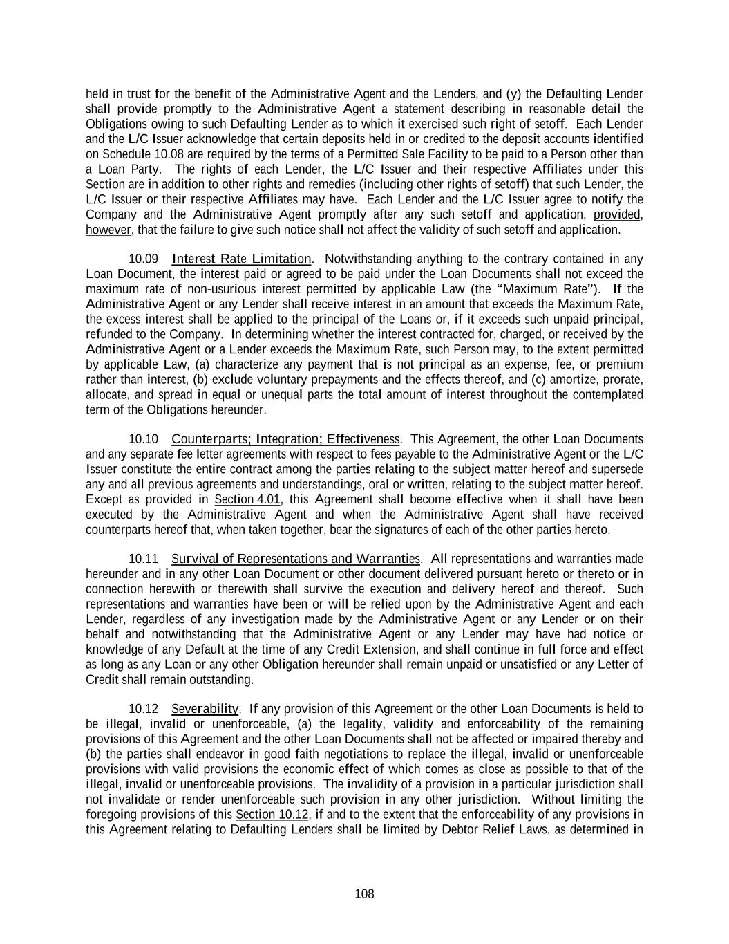 108 held in trust for the benefit of the Administrative Agent and the Lenders, and (y) the Defaulting Lender shall provide promptly to the Administrative Agent a statement describing in reasonable detail the Obligations owing to such Defaulting Lender as to which it exercised such right of setoff. Each Lender and the L/C Issuer acknowledge that certain deposits held in or credited to the deposit accounts identified on Schedule 10.08 are required by the terms of a Permitted Sale Facility to be paid to a Person other than a Loan Party. The rights of each Lender, the L/C Issuer and their respective Affiliates under this Section are in addition to other rights and remedies (including other rights of setoff) that such Lender, the L/C Issuer or their respective Affiliates may have. Each Lender and the L/C Issuer agree to notify the Company and the Administrative Agent promptly after any such setoff and application, provided, however, that the failure to give such notice shall not affect the validity of such setoff and application. 10.09 Interest Rate Limitation. Notwithstanding anything to the contrary contained in any Loan Document, the interest paid or agreed to be paid under the Loan Documents shall not exceed the maximum rate of non-usurious interest permitted by applicable Law (the “Maximum Rate”). If the Administrative Agent or any Lender shall receive interest in an amount that exceeds the Maximum Rate, the excess interest shall be applied to the principal of the Loans or, if it exceeds such unpaid principal, refunded to the Company. In determining whether the interest contracted for, charged, or received by the Administrative Agent or a Lender exceeds the Maximum Rate, such Person may, to the extent permitted by applicable Law, (a) characterize any payment that is not principal as an expense, fee, or premium rather than interest, (b) exclude voluntary prepayments and the effects thereof, and (c) amortize, prorate, allocate, and spread in equal or unequal parts the total amount of interest throughout the contemplated term of the Obligations hereunder. 10.10 Counterparts; Integration; Effectiveness. This Agreement, the other Loan Documents and any separate fee letter agreements with respect to fees payable to the Administrative Agent or the L/C Issuer constitute the entire contract among the parties relating to the subject matter hereof and supersede any and all previous agreements and understandings, oral or written, relating to the subject matter hereof. Except as provided in Section 4.01, this Agreement shall become effective when it shall have been executed by the Administrative Agent and when the Administrative Agent shall have received counterparts hereof that, when taken together, bear the signatures of each of the other parties hereto. 10.11 Survival of Representations and Warranties. All representations and warranties made hereunder and in any other Loan Document or other document delivered pursuant hereto or thereto or in connection herewith or therewith shall survive the execution and delivery hereof and thereof. Such representations and warranties have been or will be relied upon by the Administrative Agent and each Lender, regardless of any investigation made by the Administrative Agent or any Lender or on their behalf and notwithstanding that the Administrative Agent or any Lender may have had notice or knowledge of any Default at the time of any Credit Extension, and shall continue in full force and effect as long as any Loan or any other Obligation hereunder shall remain unpaid or unsatisfied or any Letter of Credit shall remain outstanding. 10.12 Severability. If any provision of this Agreement or the other Loan Documents is held to be illegal, invalid or unenforceable, (a) the legality, validity and enforceability of the remaining provisions of this Agreement and the other Loan Documents shall not be affected or impaired thereby and (b) the parties shall endeavor in good faith negotiations to replace the illegal, invalid or unenforceable provisions with valid provisions the economic effect of which comes as close as possible to that of the illegal, invalid or unenforceable provisions. The invalidity of a provision in a particular jurisdiction shall not invalidate or render unenforceable such provision in any other jurisdiction. Without limiting the foregoing provisions of this Section 10.12, if and to the extent that the enforceability of any provisions in this Agreement relating to Defaulting Lenders shall be limited by Debtor Relief Laws, as determined in