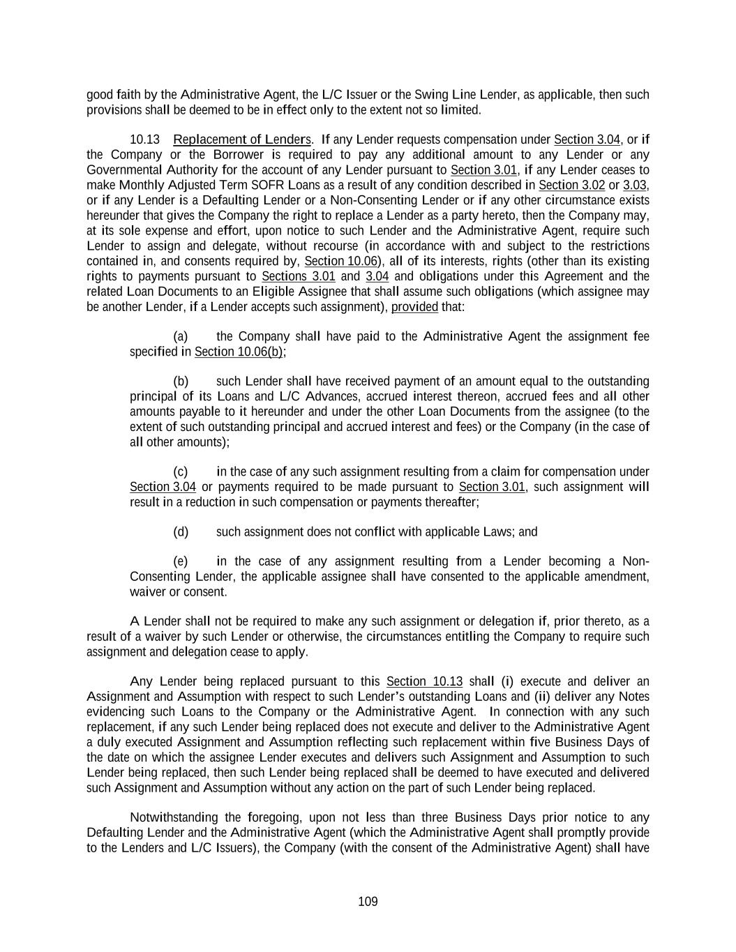 109 good faith by the Administrative Agent, the L/C Issuer or the Swing Line Lender, as applicable, then such provisions shall be deemed to be in effect only to the extent not so limited. 10.13 Replacement of Lenders. If any Lender requests compensation under Section 3.04, or if the Company or the Borrower is required to pay any additional amount to any Lender or any Governmental Authority for the account of any Lender pursuant to Section 3.01, if any Lender ceases to make Monthly Adjusted Term SOFR Loans as a result of any condition described in Section 3.02 or 3.03, or if any Lender is a Defaulting Lender or a Non-Consenting Lender or if any other circumstance exists hereunder that gives the Company the right to replace a Lender as a party hereto, then the Company may, at its sole expense and effort, upon notice to such Lender and the Administrative Agent, require such Lender to assign and delegate, without recourse (in accordance with and subject to the restrictions contained in, and consents required by, Section 10.06), all of its interests, rights (other than its existing rights to payments pursuant to Sections 3.01 and 3.04 and obligations under this Agreement and the related Loan Documents to an Eligible Assignee that shall assume such obligations (which assignee may be another Lender, if a Lender accepts such assignment), provided that: (a) the Company shall have paid to the Administrative Agent the assignment fee specified in Section 10.06(b); (b) such Lender shall have received payment of an amount equal to the outstanding principal of its Loans and L/C Advances, accrued interest thereon, accrued fees and all other amounts payable to it hereunder and under the other Loan Documents from the assignee (to the extent of such outstanding principal and accrued interest and fees) or the Company (in the case of all other amounts); (c) in the case of any such assignment resulting from a claim for compensation under Section 3.04 or payments required to be made pursuant to Section 3.01, such assignment will result in a reduction in such compensation or payments thereafter; (d) such assignment does not conflict with applicable Laws; and (e) in the case of any assignment resulting from a Lender becoming a Non- Consenting Lender, the applicable assignee shall have consented to the applicable amendment, waiver or consent. A Lender shall not be required to make any such assignment or delegation if, prior thereto, as a result of a waiver by such Lender or otherwise, the circumstances entitling the Company to require such assignment and delegation cease to apply. Any Lender being replaced pursuant to this Section 10.13 shall (i) execute and deliver an Assignment and Assumption with respect to such Lender’s outstanding Loans and (ii) deliver any Notes evidencing such Loans to the Company or the Administrative Agent. In connection with any such replacement, if any such Lender being replaced does not execute and deliver to the Administrative Agent a duly executed Assignment and Assumption reflecting such replacement within five Business Days of the date on which the assignee Lender executes and delivers such Assignment and Assumption to such Lender being replaced, then such Lender being replaced shall be deemed to have executed and delivered such Assignment and Assumption without any action on the part of such Lender being replaced. Notwithstanding the foregoing, upon not less than three Business Days prior notice to any Defaulting Lender and the Administrative Agent (which the Administrative Agent shall promptly provide to the Lenders and L/C Issuers), the Company (with the consent of the Administrative Agent) shall have