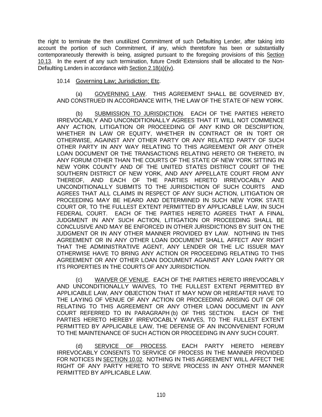 110 the right to terminate the then unutilized Commitment of such Defaulting Lender, after taking into account the portion of such Commitment, if any, which theretofore has been or substantially contemporaneously therewith is being, assigned pursuant to the foregoing provisions of this Section 10.13. In the event of any such termination, future Credit Extensions shall be allocated to the Non- Defaulting Lenders in accordance with Section 2.18(a)(iv). 10.14 Governing Law; Jurisdiction; Etc. (a) GOVERNING LAW. THIS AGREEMENT SHALL BE GOVERNED BY, AND CONSTRUED IN ACCORDANCE WITH, THE LAW OF THE STATE OF NEW YORK. (b) SUBMISSION TO JURISDICTION. EACH OF THE PARTIES HERETO IRREVOCABLY AND UNCONDITIONALLY AGREES THAT IT WILL NOT COMMENCE ANY ACTION, LITIGATION OR PROCEEDING OF ANY KIND OR DESCRIPTION, WHETHER IN LAW OR EQUITY, WHETHER IN CONTRACT OR IN TORT OR OTHERWISE, AGAINST ANY OTHER PARTY OR ANY RELATED PARTY OF SUCH OTHER PARTY IN ANY WAY RELATING TO THIS AGREEMENT OR ANY OTHER LOAN DOCUMENT OR THE TRANSACTIONS RELATING HERETO OR THERETO, IN ANY FORUM OTHER THAN THE COURTS OF THE STATE OF NEW YORK SITTING IN NEW YORK COUNTY AND OF THE UNITED STATES DISTRICT COURT OF THE SOUTHERN DISTRICT OF NEW YORK, AND ANY APPELLATE COURT FROM ANY THEREOF, AND EACH OF THE PARTIES HERETO IRREVOCABLY AND UNCONDITIONALLY SUBMITS TO THE JURISDICTION OF SUCH COURTS AND AGREES THAT ALL CLAIMS IN RESPECT OF ANY SUCH ACTION, LITIGATION OR PROCEEDING MAY BE HEARD AND DETERMINED IN SUCH NEW YORK STATE COURT OR, TO THE FULLEST EXTENT PERMITTED BY APPLICABLE LAW, IN SUCH FEDERAL COURT. EACH OF THE PARTIES HERETO AGREES THAT A FINAL JUDGMENT IN ANY SUCH ACTION, LITIGATION OR PROCEEDING SHALL BE CONCLUSIVE AND MAY BE ENFORCED IN OTHER JURISDICTIONS BY SUIT ON THE JUDGMENT OR IN ANY OTHER MANNER PROVIDED BY LAW. NOTHING IN THIS AGREEMENT OR IN ANY OTHER LOAN DOCUMENT SHALL AFFECT ANY RIGHT THAT THE ADMINISTRATIVE AGENT, ANY LENDER OR THE L/C ISSUER MAY OTHERWISE HAVE TO BRING ANY ACTION OR PROCEEDING RELATING TO THIS AGREEMENT OR ANY OTHER LOAN DOCUMENT AGAINST ANY LOAN PARTY OR ITS PROPERTIES IN THE COURTS OF ANY JURISDICTION. (c) WAIVER OF VENUE. EACH OF THE PARTIES HERETO IRREVOCABLY AND UNCONDITIONALLY WAIVES, TO THE FULLEST EXTENT PERMITTED BY APPLICABLE LAW, ANY OBJECTION THAT IT MAY NOW OR HEREAFTER HAVE TO THE LAYING OF VENUE OF ANY ACTION OR PROCEEDING ARISING OUT OF OR RELATING TO THIS AGREEMENT OR ANY OTHER LOAN DOCUMENT IN ANY COURT REFERRED TO IN PARAGRAPH (b) OF THIS SECTION. EACH OF THE PARTIES HERETO HEREBY IRREVOCABLY WAIVES, TO THE FULLEST EXTENT PERMITTED BY APPLICABLE LAW, THE DEFENSE OF AN INCONVENIENT FORUM TO THE MAINTENANCE OF SUCH ACTION OR PROCEEDING IN ANY SUCH COURT. (d) SERVICE OF PROCESS. EACH PARTY HERETO HEREBY IRREVOCABLY CONSENTS TO SERVICE OF PROCESS IN THE MANNER PROVIDED FOR NOTICES IN SECTION 10.02. NOTHING IN THIS AGREEMENT WILL AFFECT THE RIGHT OF ANY PARTY HERETO TO SERVE PROCESS IN ANY OTHER MANNER PERMITTED BY APPLICABLE LAW.