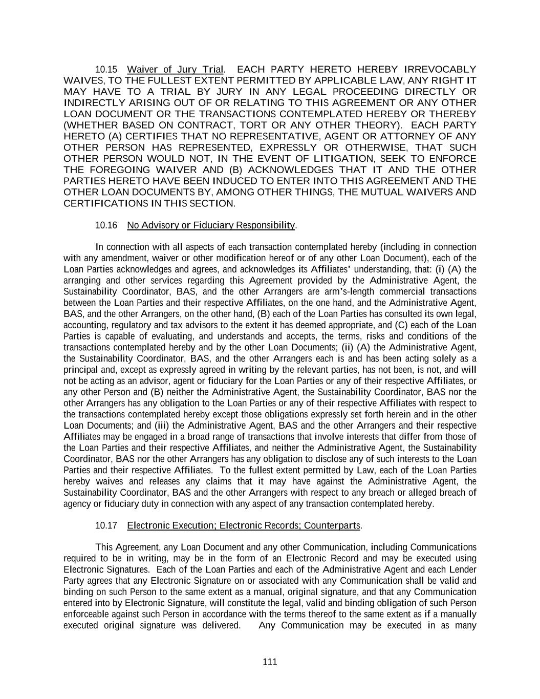 111 10.15 Waiver of Jury Trial. EACH PARTY HERETO HEREBY IRREVOCABLY WAIVES, TO THE FULLEST EXTENT PERMITTED BY APPLICABLE LAW, ANY RIGHT IT MAY HAVE TO A TRIAL BY JURY IN ANY LEGAL PROCEEDING DIRECTLY OR INDIRECTLY ARISING OUT OF OR RELATING TO THIS AGREEMENT OR ANY OTHER LOAN DOCUMENT OR THE TRANSACTIONS CONTEMPLATED HEREBY OR THEREBY (WHETHER BASED ON CONTRACT, TORT OR ANY OTHER THEORY). EACH PARTY HERETO (A) CERTIFIES THAT NO REPRESENTATIVE, AGENT OR ATTORNEY OF ANY OTHER PERSON HAS REPRESENTED, EXPRESSLY OR OTHERWISE, THAT SUCH OTHER PERSON WOULD NOT, IN THE EVENT OF LITIGATION, SEEK TO ENFORCE THE FOREGOING WAIVER AND (B) ACKNOWLEDGES THAT IT AND THE OTHER PARTIES HERETO HAVE BEEN INDUCED TO ENTER INTO THIS AGREEMENT AND THE OTHER LOAN DOCUMENTS BY, AMONG OTHER THINGS, THE MUTUAL WAIVERS AND CERTIFICATIONS IN THIS SECTION. 10.16 No Advisory or Fiduciary Responsibility. In connection with all aspects of each transaction contemplated hereby (including in connection with any amendment, waiver or other modification hereof or of any other Loan Document), each of the Loan Parties acknowledges and agrees, and acknowledges its Affiliates’ understanding, that: (i) (A) the arranging and other services regarding this Agreement provided by the Administrative Agent, the Sustainability Coordinator, BAS, and the other Arrangers are arm’s-length commercial transactions between the Loan Parties and their respective Affiliates, on the one hand, and the Administrative Agent, BAS, and the other Arrangers, on the other hand, (B) each of the Loan Parties has consulted its own legal, accounting, regulatory and tax advisors to the extent it has deemed appropriate, and (C) each of the Loan Parties is capable of evaluating, and understands and accepts, the terms, risks and conditions of the transactions contemplated hereby and by the other Loan Documents; (ii) (A) the Administrative Agent, the Sustainability Coordinator, BAS, and the other Arrangers each is and has been acting solely as a principal and, except as expressly agreed in writing by the relevant parties, has not been, is not, and will not be acting as an advisor, agent or fiduciary for the Loan Parties or any of their respective Affiliates, or any other Person and (B) neither the Administrative Agent, the Sustainability Coordinator, BAS nor the other Arrangers has any obligation to the Loan Parties or any of their respective Affiliates with respect to the transactions contemplated hereby except those obligations expressly set forth herein and in the other Loan Documents; and (iii) the Administrative Agent, BAS and the other Arrangers and their respective Affiliates may be engaged in a broad range of transactions that involve interests that differ from those of the Loan Parties and their respective Affiliates, and neither the Administrative Agent, the Sustainability Coordinator, BAS nor the other Arrangers has any obligation to disclose any of such interests to the Loan Parties and their respective Affiliates. To the fullest extent permitted by Law, each of the Loan Parties hereby waives and releases any claims that it may have against the Administrative Agent, the Sustainability Coordinator, BAS and the other Arrangers with respect to any breach or alleged breach of agency or fiduciary duty in connection with any aspect of any transaction contemplated hereby. 10.17 Electronic Execution; Electronic Records; Counterparts. This Agreement, any Loan Document and any other Communication, including Communications required to be in writing, may be in the form of an Electronic Record and may be executed using Electronic Signatures. Each of the Loan Parties and each of the Administrative Agent and each Lender Party agrees that any Electronic Signature on or associated with any Communication shall be valid and binding on such Person to the same extent as a manual, original signature, and that any Communication entered into by Electronic Signature, will constitute the legal, valid and binding obligation of such Person enforceable against such Person in accordance with the terms thereof to the same extent as if a manually executed original signature was delivered. Any Communication may be executed in as many