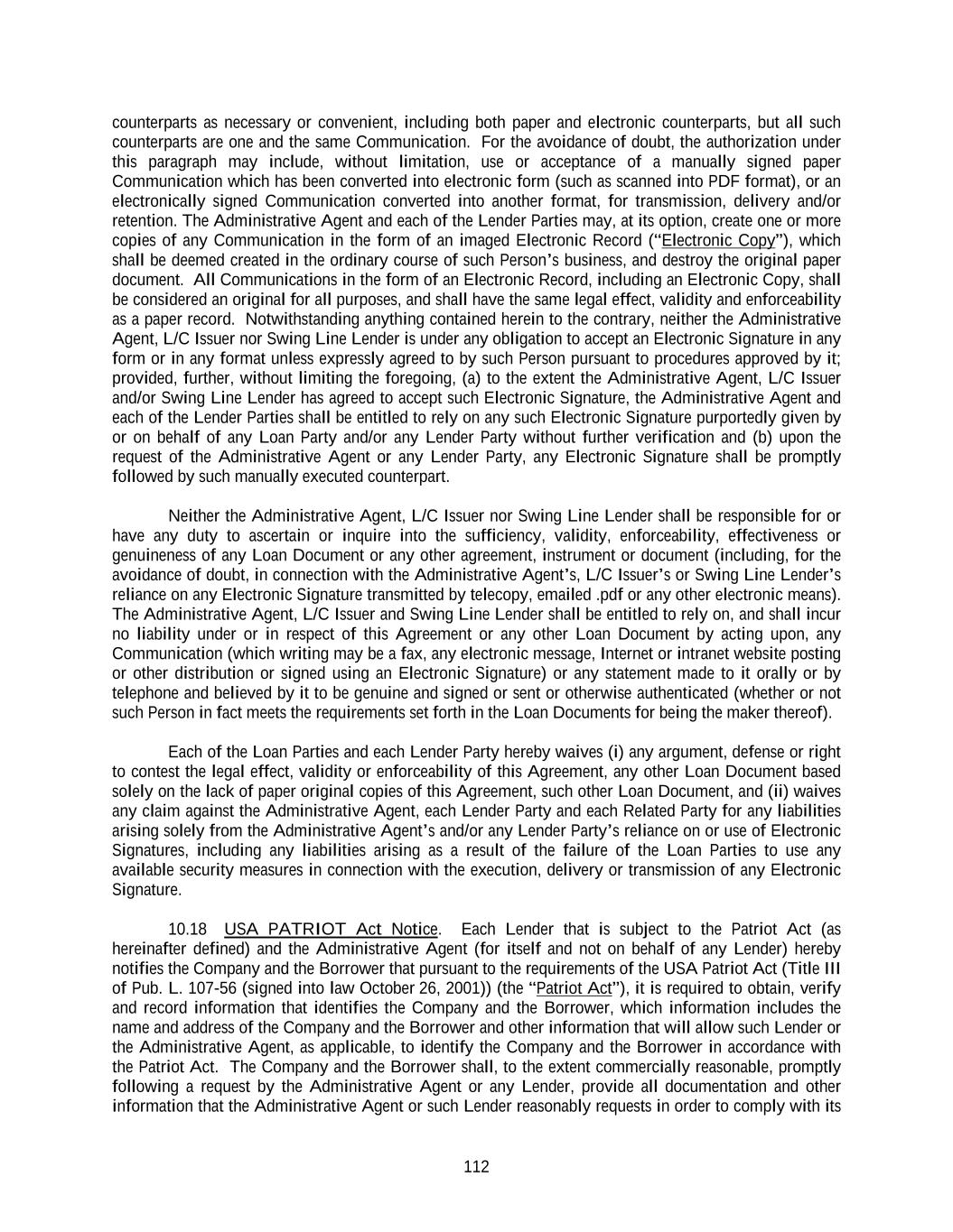 112 counterparts as necessary or convenient, including both paper and electronic counterparts, but all such counterparts are one and the same Communication. For the avoidance of doubt, the authorization under this paragraph may include, without limitation, use or acceptance of a manually signed paper Communication which has been converted into electronic form (such as scanned into PDF format), or an electronically signed Communication converted into another format, for transmission, delivery and/or retention. The Administrative Agent and each of the Lender Parties may, at its option, create one or more copies of any Communication in the form of an imaged Electronic Record (“Electronic Copy”), which shall be deemed created in the ordinary course of such Person’s business, and destroy the original paper document. All Communications in the form of an Electronic Record, including an Electronic Copy, shall be considered an original for all purposes, and shall have the same legal effect, validity and enforceability as a paper record. Notwithstanding anything contained herein to the contrary, neither the Administrative Agent, L/C Issuer nor Swing Line Lender is under any obligation to accept an Electronic Signature in any form or in any format unless expressly agreed to by such Person pursuant to procedures approved by it; provided, further, without limiting the foregoing, (a) to the extent the Administrative Agent, L/C Issuer and/or Swing Line Lender has agreed to accept such Electronic Signature, the Administrative Agent and each of the Lender Parties shall be entitled to rely on any such Electronic Signature purportedly given by or on behalf of any Loan Party and/or any Lender Party without further verification and (b) upon the request of the Administrative Agent or any Lender Party, any Electronic Signature shall be promptly followed by such manually executed counterpart. Neither the Administrative Agent, L/C Issuer nor Swing Line Lender shall be responsible for or have any duty to ascertain or inquire into the sufficiency, validity, enforceability, effectiveness or genuineness of any Loan Document or any other agreement, instrument or document (including, for the avoidance of doubt, in connection with the Administrative Agent’s, L/C Issuer’s or Swing Line Lender’s reliance on any Electronic Signature transmitted by telecopy, emailed .pdf or any other electronic means). The Administrative Agent, L/C Issuer and Swing Line Lender shall be entitled to rely on, and shall incur no liability under or in respect of this Agreement or any other Loan Document by acting upon, any Communication (which writing may be a fax, any electronic message, Internet or intranet website posting or other distribution or signed using an Electronic Signature) or any statement made to it orally or by telephone and believed by it to be genuine and signed or sent or otherwise authenticated (whether or not such Person in fact meets the requirements set forth in the Loan Documents for being the maker thereof). Each of the Loan Parties and each Lender Party hereby waives (i) any argument, defense or right to contest the legal effect, validity or enforceability of this Agreement, any other Loan Document based solely on the lack of paper original copies of this Agreement, such other Loan Document, and (ii) waives any claim against the Administrative Agent, each Lender Party and each Related Party for any liabilities arising solely from the Administrative Agent’s and/or any Lender Party’s reliance on or use of Electronic Signatures, including any liabilities arising as a result of the failure of the Loan Parties to use any available security measures in connection with the execution, delivery or transmission of any Electronic Signature. 10.18 USA PATRIOT Act Notice. Each Lender that is subject to the Patriot Act (as hereinafter defined) and the Administrative Agent (for itself and not on behalf of any Lender) hereby notifies the Company and the Borrower that pursuant to the requirements of the USA Patriot Act (Title III of Pub. L. 107-56 (signed into law October 26, 2001)) (the “Patriot Act”), it is required to obtain, verify and record information that identifies the Company and the Borrower, which information includes the name and address of the Company and the Borrower and other information that will allow such Lender or the Administrative Agent, as applicable, to identify the Company and the Borrower in accordance with the Patriot Act. The Company and the Borrower shall, to the extent commercially reasonable, promptly following a request by the Administrative Agent or any Lender, provide all documentation and other information that the Administrative Agent or such Lender reasonably requests in order to comply with its