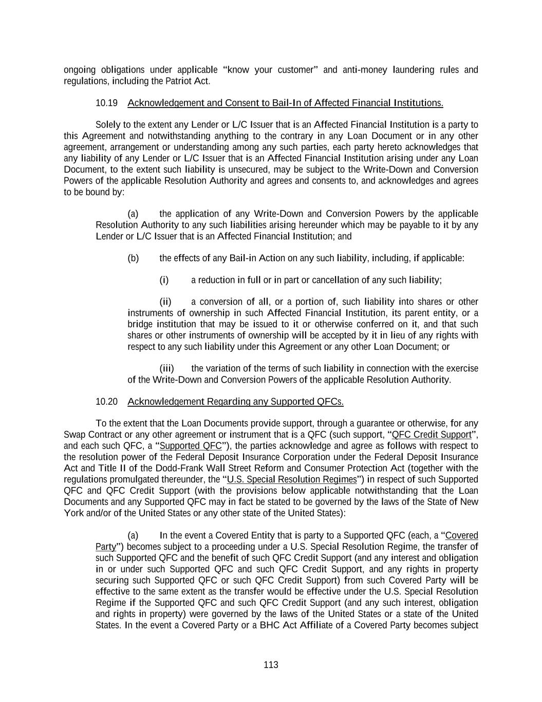 113 ongoing obligations under applicable “know your customer” and anti-money laundering rules and regulations, including the Patriot Act. 10.19 Acknowledgement and Consent to Bail-In of Affected Financial Institutions. Solely to the extent any Lender or L/C Issuer that is an Affected Financial Institution is a party to this Agreement and notwithstanding anything to the contrary in any Loan Document or in any other agreement, arrangement or understanding among any such parties, each party hereto acknowledges that any liability of any Lender or L/C Issuer that is an Affected Financial Institution arising under any Loan Document, to the extent such liability is unsecured, may be subject to the Write-Down and Conversion Powers of the applicable Resolution Authority and agrees and consents to, and acknowledges and agrees to be bound by: (a) the application of any Write-Down and Conversion Powers by the applicable Resolution Authority to any such liabilities arising hereunder which may be payable to it by any Lender or L/C Issuer that is an Affected Financial Institution; and (b) the effects of any Bail-in Action on any such liability, including, if applicable: (i) a reduction in full or in part or cancellation of any such liability; (ii) a conversion of all, or a portion of, such liability into shares or other instruments of ownership in such Affected Financial Institution, its parent entity, or a bridge institution that may be issued to it or otherwise conferred on it, and that such shares or other instruments of ownership will be accepted by it in lieu of any rights with respect to any such liability under this Agreement or any other Loan Document; or (iii) the variation of the terms of such liability in connection with the exercise of the Write-Down and Conversion Powers of the applicable Resolution Authority. 10.20 Acknowledgement Regarding any Supported QFCs. To the extent that the Loan Documents provide support, through a guarantee or otherwise, for any Swap Contract or any other agreement or instrument that is a QFC (such support, “QFC Credit Support”, and each such QFC, a “Supported QFC”), the parties acknowledge and agree as follows with respect to the resolution power of the Federal Deposit Insurance Corporation under the Federal Deposit Insurance Act and Title II of the Dodd-Frank Wall Street Reform and Consumer Protection Act (together with the regulations promulgated thereunder, the “U.S. Special Resolution Regimes”) in respect of such Supported QFC and QFC Credit Support (with the provisions below applicable notwithstanding that the Loan Documents and any Supported QFC may in fact be stated to be governed by the laws of the State of New York and/or of the United States or any other state of the United States): (a) In the event a Covered Entity that is party to a Supported QFC (each, a “Covered Party”) becomes subject to a proceeding under a U.S. Special Resolution Regime, the transfer of such Supported QFC and the benefit of such QFC Credit Support (and any interest and obligation in or under such Supported QFC and such QFC Credit Support, and any rights in property securing such Supported QFC or such QFC Credit Support) from such Covered Party will be effective to the same extent as the transfer would be effective under the U.S. Special Resolution Regime if the Supported QFC and such QFC Credit Support (and any such interest, obligation and rights in property) were governed by the laws of the United States or a state of the United States. In the event a Covered Party or a BHC Act Affiliate of a Covered Party becomes subject