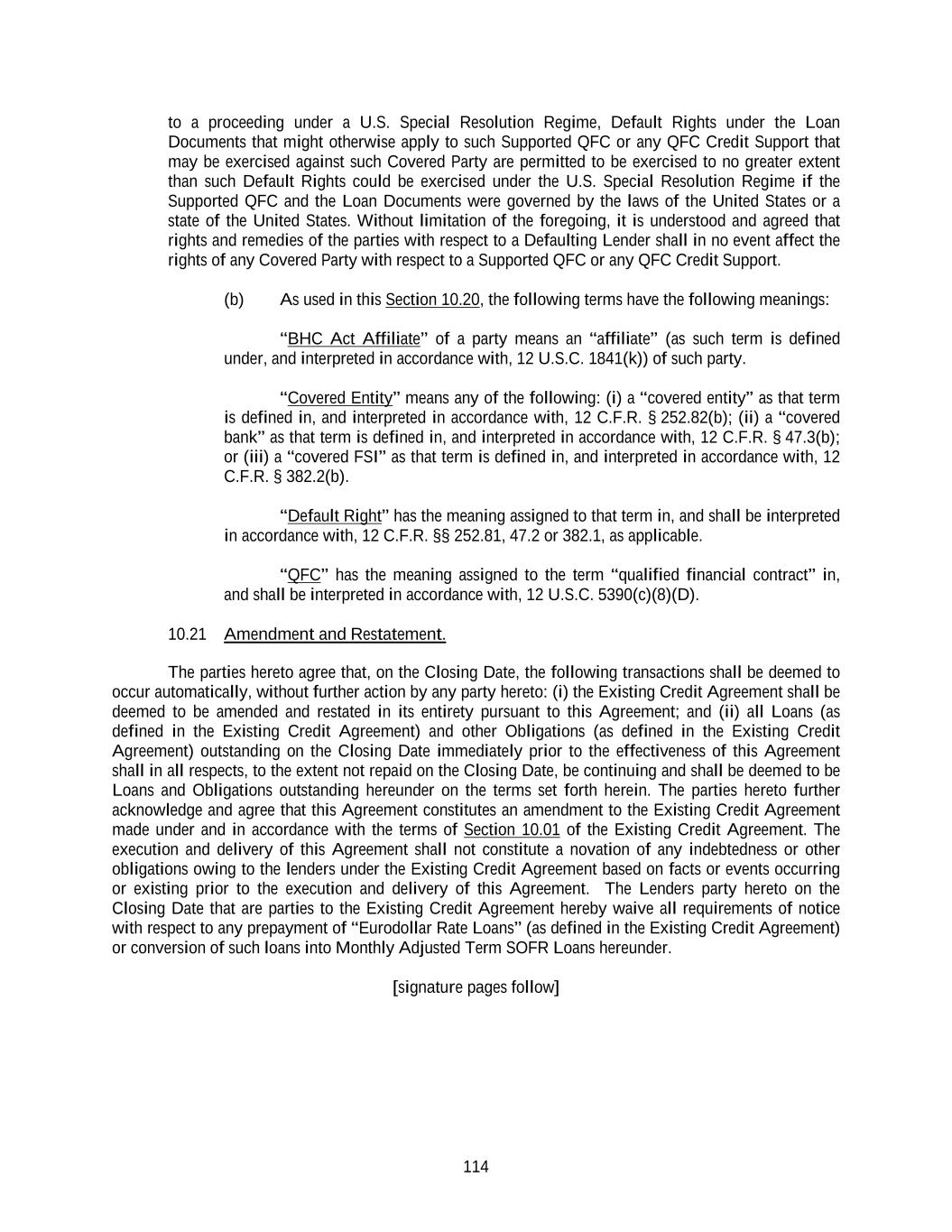 114 to a proceeding under a U.S. Special Resolution Regime, Default Rights under the Loan Documents that might otherwise apply to such Supported QFC or any QFC Credit Support that may be exercised against such Covered Party are permitted to be exercised to no greater extent than such Default Rights could be exercised under the U.S. Special Resolution Regime if the Supported QFC and the Loan Documents were governed by the laws of the United States or a state of the United States. Without limitation of the foregoing, it is understood and agreed that rights and remedies of the parties with respect to a Defaulting Lender shall in no event affect the rights of any Covered Party with respect to a Supported QFC or any QFC Credit Support. (b) As used in this Section 10.20, the following terms have the following meanings: “BHC Act Affiliate” of a party means an “affiliate” (as such term is defined under, and interpreted in accordance with, 12 U.S.C. 1841(k)) of such party. “Covered Entity” means any of the following: (i) a “covered entity” as that term is defined in, and interpreted in accordance with, 12 C.F.R. § 252.82(b); (ii) a “covered bank” as that term is defined in, and interpreted in accordance with, 12 C.F.R. § 47.3(b); or (iii) a “covered FSI” as that term is defined in, and interpreted in accordance with, 12 C.F.R. § 382.2(b). “Default Right” has the meaning assigned to that term in, and shall be interpreted in accordance with, 12 C.F.R. §§ 252.81, 47.2 or 382.1, as applicable. “QFC” has the meaning assigned to the term “qualified financial contract” in, and shall be interpreted in accordance with, 12 U.S.C. 5390(c)(8)(D). 10.21 Amendment and Restatement. The parties hereto agree that, on the Closing Date, the following transactions shall be deemed to occur automatically, without further action by any party hereto: (i) the Existing Credit Agreement shall be deemed to be amended and restated in its entirety pursuant to this Agreement; and (ii) all Loans (as defined in the Existing Credit Agreement) and other Obligations (as defined in the Existing Credit Agreement) outstanding on the Closing Date immediately prior to the effectiveness of this Agreement shall in all respects, to the extent not repaid on the Closing Date, be continuing and shall be deemed to be Loans and Obligations outstanding hereunder on the terms set forth herein. The parties hereto further acknowledge and agree that this Agreement constitutes an amendment to the Existing Credit Agreement made under and in accordance with the terms of Section 10.01 of the Existing Credit Agreement. The execution and delivery of this Agreement shall not constitute a novation of any indebtedness or other obligations owing to the lenders under the Existing Credit Agreement based on facts or events occurring or existing prior to the execution and delivery of this Agreement. The Lenders party hereto on the Closing Date that are parties to the Existing Credit Agreement hereby waive all requirements of notice with respect to any prepayment of “Eurodollar Rate Loans” (as defined in the Existing Credit Agreement) or conversion of such loans into Monthly Adjusted Term SOFR Loans hereunder. [signature pages follow]
