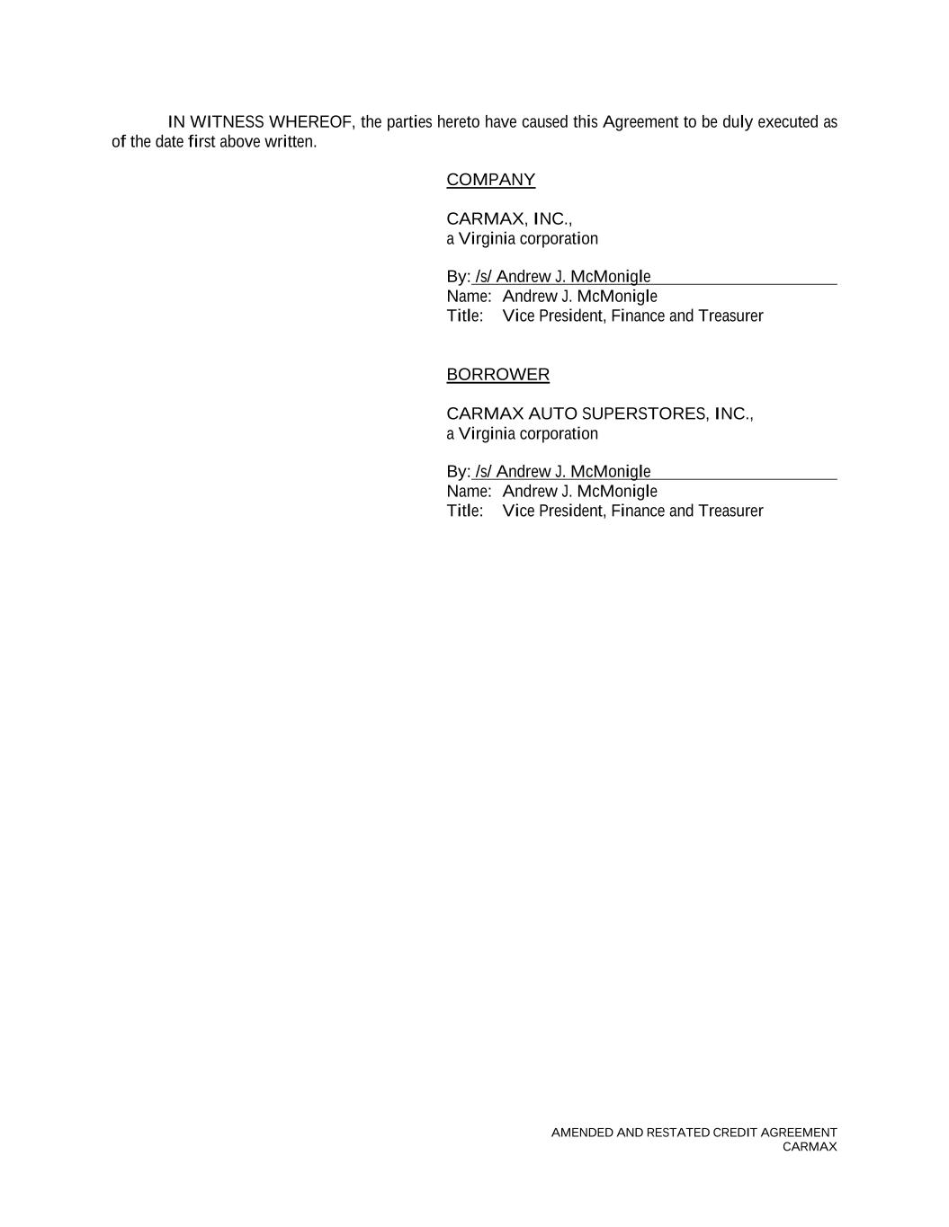AMENDED AND RESTATED CREDIT AGREEMENT CARMAX IN WITNESS WHEREOF, the parties hereto have caused this Agreement to be duly executed as of the date first above written. COMPANY CARMAX, INC., a Virginia corporation By: /s/ Andrew J. McMonigle Name: Andrew J. McMonigle Title: Vice President, Finance and Treasurer BORROWER CARMAX AUTO SUPERSTORES, INC., a Virginia corporation By: /s/ Andrew J. McMonigle Name: Andrew J. McMonigle Title: Vice President, Finance and Treasurer