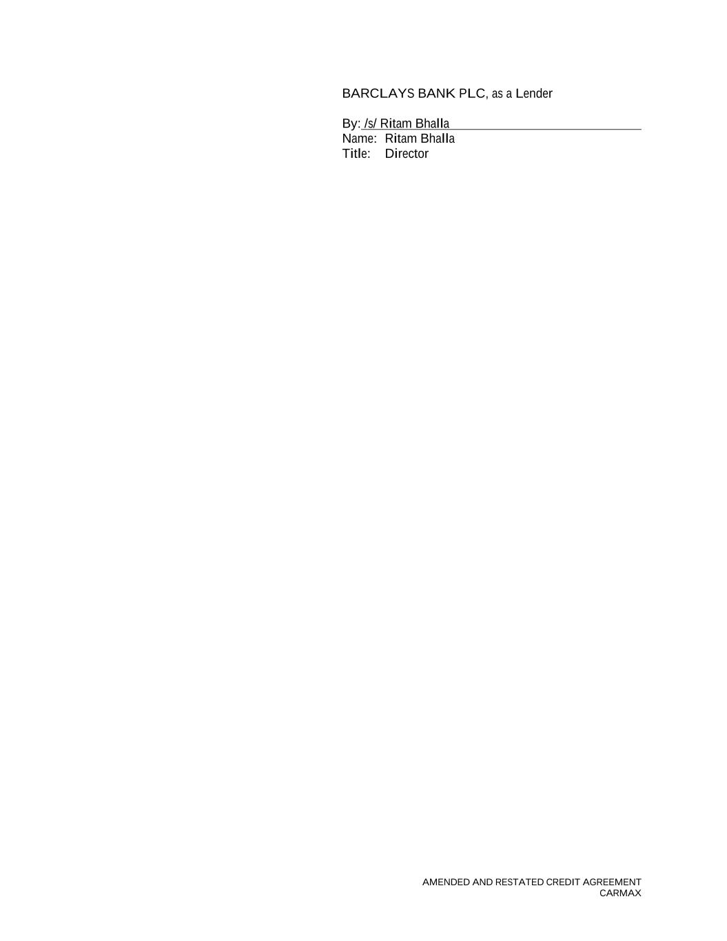 AMENDED AND RESTATED CREDIT AGREEMENT CARMAX BARCLAYS BANK PLC, as a Lender By: /s/ Ritam Bhalla Name: Ritam Bhalla Title: Director