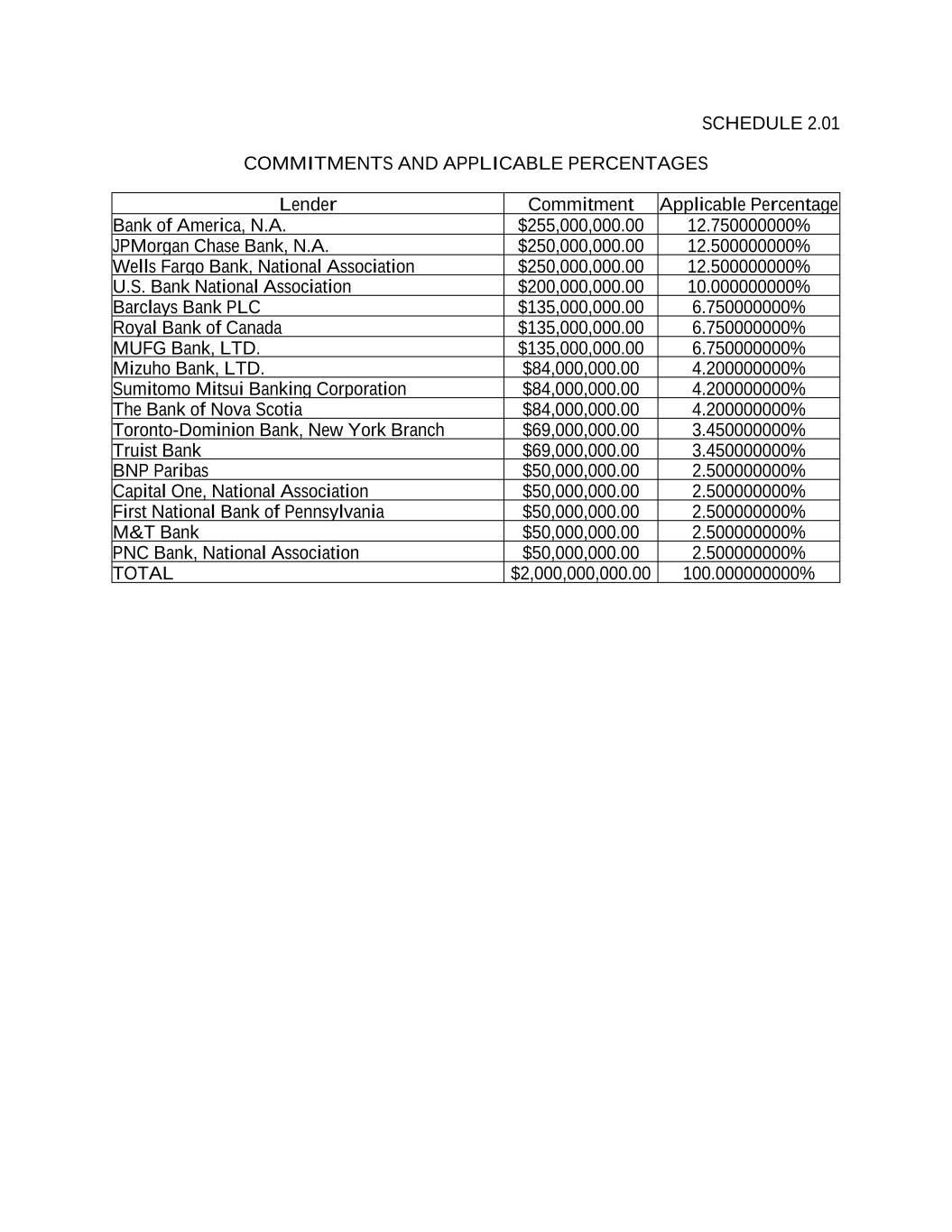 SCHEDULE 2.01 COMMITMENTS AND APPLICABLE PERCENTAGES Lender Commitment Applicable Percentage Bank of America, N.A. $255,000,000.00 12.750000000% JPMorgan Chase Bank, N.A. $250,000,000.00 12.500000000% Wells Fargo Bank, National Association $250,000,000.00 12.500000000% U.S. Bank National Association $200,000,000.00 10.000000000% Barclays Bank PLC $135,000,000.00 6.750000000% Royal Bank of Canada $135,000,000.00 6.750000000% MUFG Bank, LTD. $135,000,000.00 6.750000000% Mizuho Bank, LTD. $84,000,000.00 4.200000000% Sumitomo Mitsui Banking Corporation $84,000,000.00 4.200000000% The Bank of Nova Scotia $84,000,000.00 4.200000000% Toronto-Dominion Bank, New York Branch $69,000,000.00 3.450000000% Truist Bank $69,000,000.00 3.450000000% BNP Paribas $50,000,000.00 2.500000000% Capital One, National Association $50,000,000.00 2.500000000% First National Bank of Pennsylvania $50,000,000.00 2.500000000% M&T Bank $50,000,000.00 2.500000000% PNC Bank, National Association $50,000,000.00 2.500000000% TOTAL $2,000,000,000.00 100.000000000%