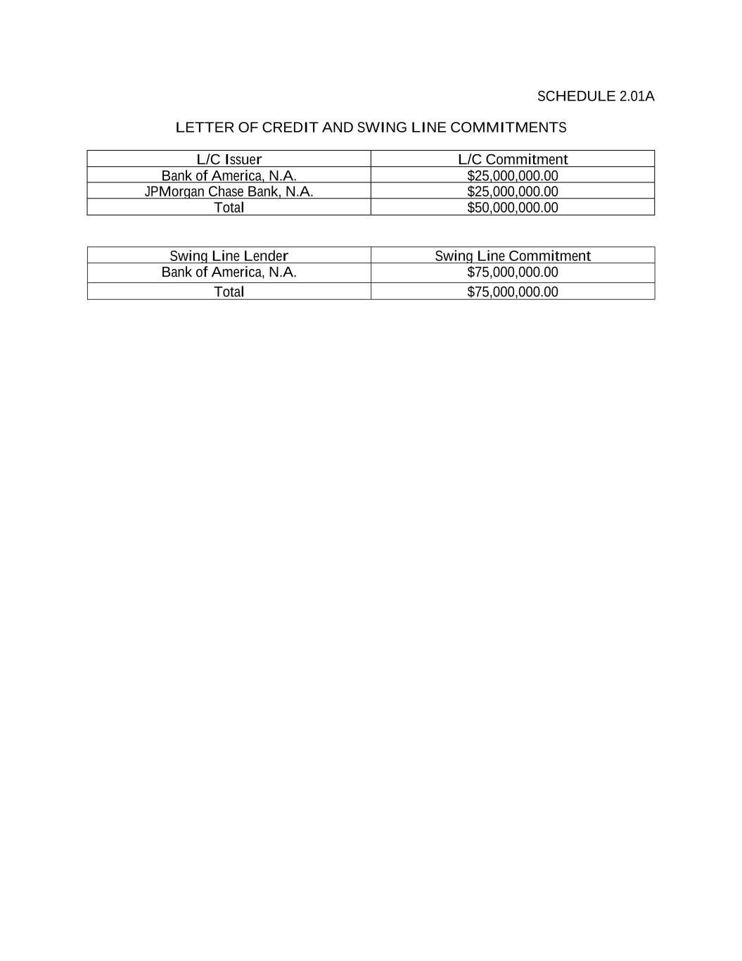 SCHEDULE 2.01A LETTER OF CREDIT AND SWING LINE COMMITMENTS L/C Issuer L/C Commitment Bank of America, N.A. $25,000,000.00 JPMorgan Chase Bank, N.A. $25,000,000.00 Total $50,000,000.00 Swing Line Lender Swing Line Commitment Bank of America, N.A. $75,000,000.00 Total $75,000,000.00