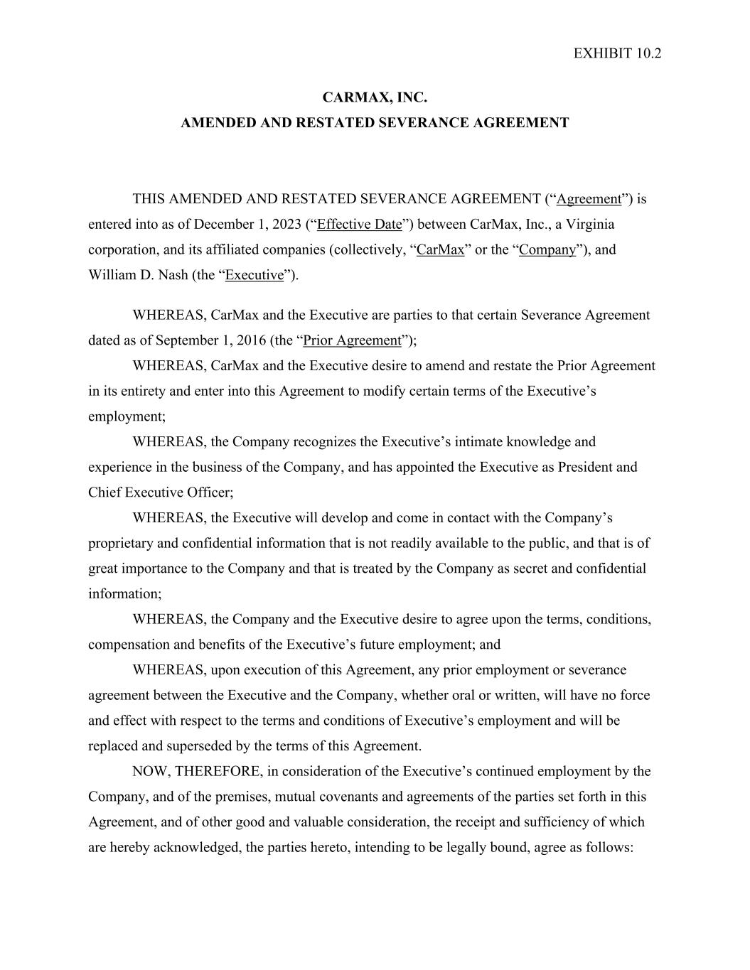 EXHIBIT 10.2 CARMAX, INC. AMENDED AND RESTATED SEVERANCE AGREEMENT THIS AMENDED AND RESTATED SEVERANCE AGREEMENT (“Agreement”) is entered into as of December 1, 2023 (“Effective Date”) between CarMax, Inc., a Virginia corporation, and its affiliated companies (collectively, “CarMax” or the “Company”), and William D. Nash (the “Executive”). WHEREAS, CarMax and the Executive are parties to that certain Severance Agreement dated as of September 1, 2016 (the “Prior Agreement”); WHEREAS, CarMax and the Executive desire to amend and restate the Prior Agreement in its entirety and enter into this Agreement to modify certain terms of the Executive’s employment; WHEREAS, the Company recognizes the Executive’s intimate knowledge and experience in the business of the Company, and has appointed the Executive as President and Chief Executive Officer; WHEREAS, the Executive will develop and come in contact with the Company’s proprietary and confidential information that is not readily available to the public, and that is of great importance to the Company and that is treated by the Company as secret and confidential information; WHEREAS, the Company and the Executive desire to agree upon the terms, conditions, compensation and benefits of the Executive’s future employment; and WHEREAS, upon execution of this Agreement, any prior employment or severance agreement between the Executive and the Company, whether oral or written, will have no force and effect with respect to the terms and conditions of Executive’s employment and will be replaced and superseded by the terms of this Agreement. NOW, THEREFORE, in consideration of the Executive’s continued employment by the Company, and of the premises, mutual covenants and agreements of the parties set forth in this Agreement, and of other good and valuable consideration, the receipt and sufficiency of which are hereby acknowledged, the parties hereto, intending to be legally bound, agree as follows: