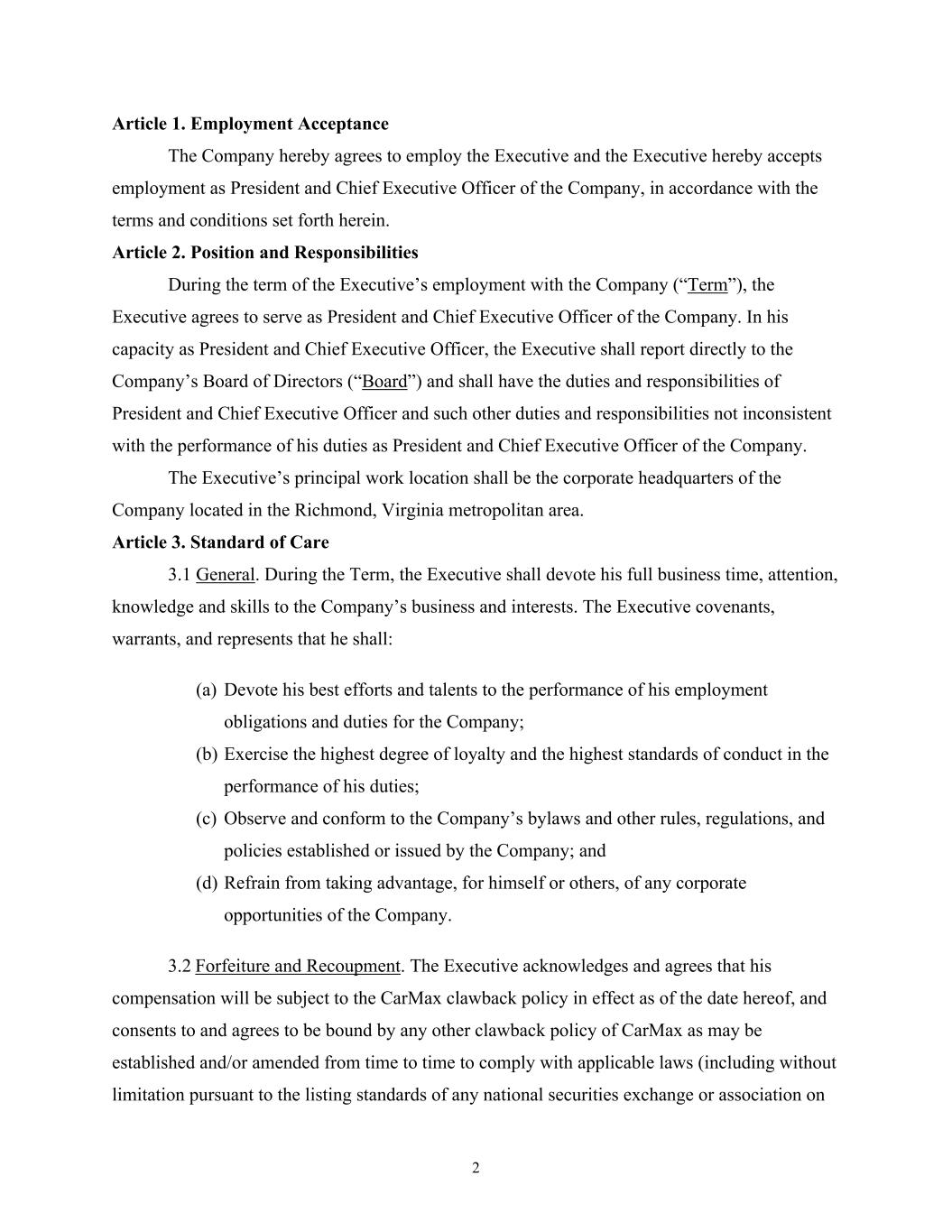 2 Article 1. Employment Acceptance The Company hereby agrees to employ the Executive and the Executive hereby accepts employment as President and Chief Executive Officer of the Company, in accordance with the terms and conditions set forth herein. Article 2. Position and Responsibilities During the term of the Executive’s employment with the Company (“Term”), the Executive agrees to serve as President and Chief Executive Officer of the Company. In his capacity as President and Chief Executive Officer, the Executive shall report directly to the Company’s Board of Directors (“Board”) and shall have the duties and responsibilities of President and Chief Executive Officer and such other duties and responsibilities not inconsistent with the performance of his duties as President and Chief Executive Officer of the Company. The Executive’s principal work location shall be the corporate headquarters of the Company located in the Richmond, Virginia metropolitan area. Article 3. Standard of Care 3.1 General. During the Term, the Executive shall devote his full business time, attention, knowledge and skills to the Company’s business and interests. The Executive covenants, warrants, and represents that he shall: (a) Devote his best efforts and talents to the performance of his employment obligations and duties for the Company; (b) Exercise the highest degree of loyalty and the highest standards of conduct in the performance of his duties; (c) Observe and conform to the Company’s bylaws and other rules, regulations, and policies established or issued by the Company; and (d) Refrain from taking advantage, for himself or others, of any corporate opportunities of the Company. 3.2 Forfeiture and Recoupment. The Executive acknowledges and agrees that his compensation will be subject to the CarMax clawback policy in effect as of the date hereof, and consents to and agrees to be bound by any other clawback policy of CarMax as may be established and/or amended from time to time to comply with applicable laws (including without limitation pursuant to the listing standards of any national securities exchange or association on