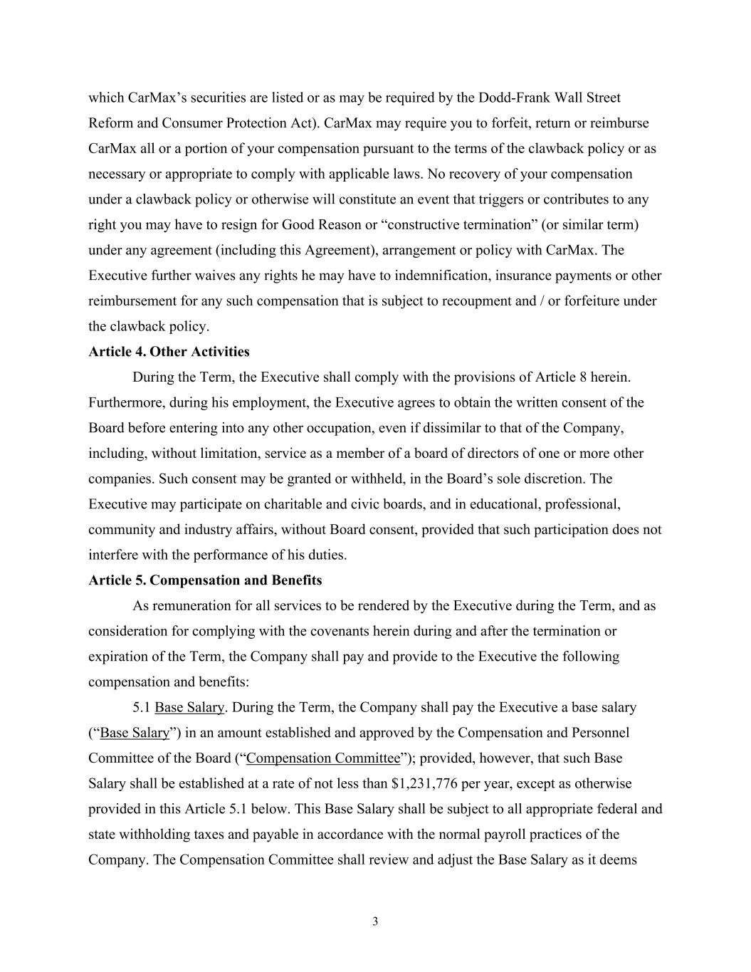 3 which CarMax’s securities are listed or as may be required by the Dodd-Frank Wall Street Reform and Consumer Protection Act). CarMax may require you to forfeit, return or reimburse CarMax all or a portion of your compensation pursuant to the terms of the clawback policy or as necessary or appropriate to comply with applicable laws. No recovery of your compensation under a clawback policy or otherwise will constitute an event that triggers or contributes to any right you may have to resign for Good Reason or “constructive termination” (or similar term) under any agreement (including this Agreement), arrangement or policy with CarMax. The Executive further waives any rights he may have to indemnification, insurance payments or other reimbursement for any such compensation that is subject to recoupment and / or forfeiture under the clawback policy. Article 4. Other Activities During the Term, the Executive shall comply with the provisions of Article 8 herein. Furthermore, during his employment, the Executive agrees to obtain the written consent of the Board before entering into any other occupation, even if dissimilar to that of the Company, including, without limitation, service as a member of a board of directors of one or more other companies. Such consent may be granted or withheld, in the Board’s sole discretion. The Executive may participate on charitable and civic boards, and in educational, professional, community and industry affairs, without Board consent, provided that such participation does not interfere with the performance of his duties. Article 5. Compensation and Benefits As remuneration for all services to be rendered by the Executive during the Term, and as consideration for complying with the covenants herein during and after the termination or expiration of the Term, the Company shall pay and provide to the Executive the following compensation and benefits: 5.1 Base Salary. During the Term, the Company shall pay the Executive a base salary (“Base Salary”) in an amount established and approved by the Compensation and Personnel Committee of the Board (“Compensation Committee”); provided, however, that such Base Salary shall be established at a rate of not less than $1,231,776 per year, except as otherwise provided in this Article 5.1 below. This Base Salary shall be subject to all appropriate federal and state withholding taxes and payable in accordance with the normal payroll practices of the Company. The Compensation Committee shall review and adjust the Base Salary as it deems