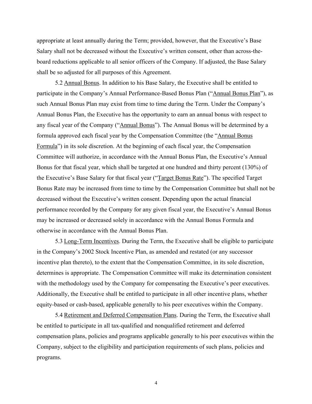 4 appropriate at least annually during the Term; provided, however, that the Executive’s Base Salary shall not be decreased without the Executive’s written consent, other than across-the- board reductions applicable to all senior officers of the Company. If adjusted, the Base Salary shall be so adjusted for all purposes of this Agreement. 5.2 Annual Bonus. In addition to his Base Salary, the Executive shall be entitled to participate in the Company’s Annual Performance-Based Bonus Plan (“Annual Bonus Plan”), as such Annual Bonus Plan may exist from time to time during the Term. Under the Company’s Annual Bonus Plan, the Executive has the opportunity to earn an annual bonus with respect to any fiscal year of the Company (“Annual Bonus”). The Annual Bonus will be determined by a formula approved each fiscal year by the Compensation Committee (the “Annual Bonus Formula”) in its sole discretion. At the beginning of each fiscal year, the Compensation Committee will authorize, in accordance with the Annual Bonus Plan, the Executive’s Annual Bonus for that fiscal year, which shall be targeted at one hundred and thirty percent (130%) of the Executive’s Base Salary for that fiscal year (“Target Bonus Rate”). The specified Target Bonus Rate may be increased from time to time by the Compensation Committee but shall not be decreased without the Executive’s written consent. Depending upon the actual financial performance recorded by the Company for any given fiscal year, the Executive’s Annual Bonus may be increased or decreased solely in accordance with the Annual Bonus Formula and otherwise in accordance with the Annual Bonus Plan. 5.3 Long-Term Incentives. During the Term, the Executive shall be eligible to participate in the Company’s 2002 Stock Incentive Plan, as amended and restated (or any successor incentive plan thereto), to the extent that the Compensation Committee, in its sole discretion, determines is appropriate. The Compensation Committee will make its determination consistent with the methodology used by the Company for compensating the Executive’s peer executives. Additionally, the Executive shall be entitled to participate in all other incentive plans, whether equity-based or cash-based, applicable generally to his peer executives within the Company. 5.4 Retirement and Deferred Compensation Plans. During the Term, the Executive shall be entitled to participate in all tax-qualified and nonqualified retirement and deferred compensation plans, policies and programs applicable generally to his peer executives within the Company, subject to the eligibility and participation requirements of such plans, policies and programs.