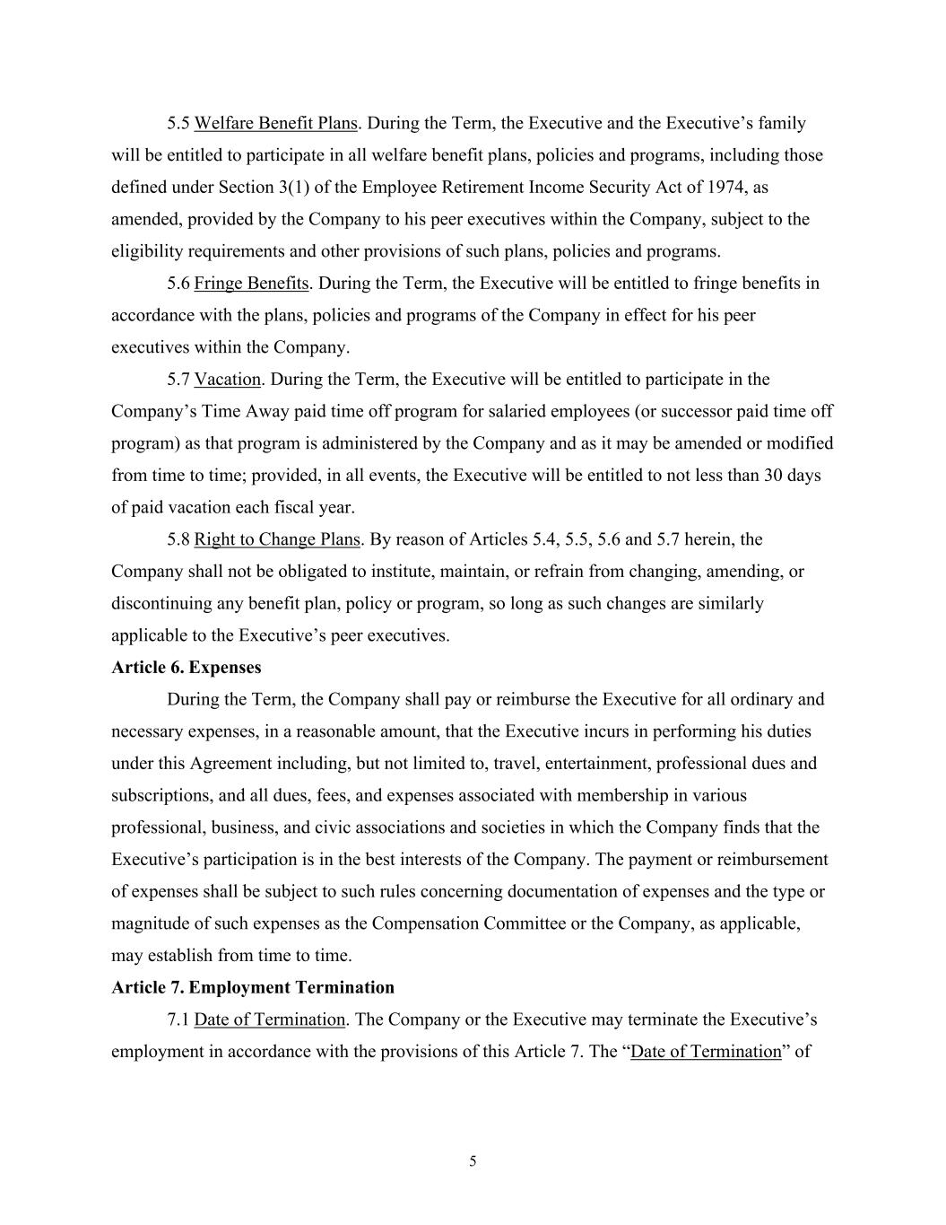5 5.5 Welfare Benefit Plans. During the Term, the Executive and the Executive’s family will be entitled to participate in all welfare benefit plans, policies and programs, including those defined under Section 3(1) of the Employee Retirement Income Security Act of 1974, as amended, provided by the Company to his peer executives within the Company, subject to the eligibility requirements and other provisions of such plans, policies and programs. 5.6 Fringe Benefits. During the Term, the Executive will be entitled to fringe benefits in accordance with the plans, policies and programs of the Company in effect for his peer executives within the Company. 5.7 Vacation. During the Term, the Executive will be entitled to participate in the Company’s Time Away paid time off program for salaried employees (or successor paid time off program) as that program is administered by the Company and as it may be amended or modified from time to time; provided, in all events, the Executive will be entitled to not less than 30 days of paid vacation each fiscal year. 5.8 Right to Change Plans. By reason of Articles 5.4, 5.5, 5.6 and 5.7 herein, the Company shall not be obligated to institute, maintain, or refrain from changing, amending, or discontinuing any benefit plan, policy or program, so long as such changes are similarly applicable to the Executive’s peer executives. Article 6. Expenses During the Term, the Company shall pay or reimburse the Executive for all ordinary and necessary expenses, in a reasonable amount, that the Executive incurs in performing his duties under this Agreement including, but not limited to, travel, entertainment, professional dues and subscriptions, and all dues, fees, and expenses associated with membership in various professional, business, and civic associations and societies in which the Company finds that the Executive’s participation is in the best interests of the Company. The payment or reimbursement of expenses shall be subject to such rules concerning documentation of expenses and the type or magnitude of such expenses as the Compensation Committee or the Company, as applicable, may establish from time to time. Article 7. Employment Termination 7.1 Date of Termination. The Company or the Executive may terminate the Executive’s employment in accordance with the provisions of this Article 7. The “Date of Termination” of