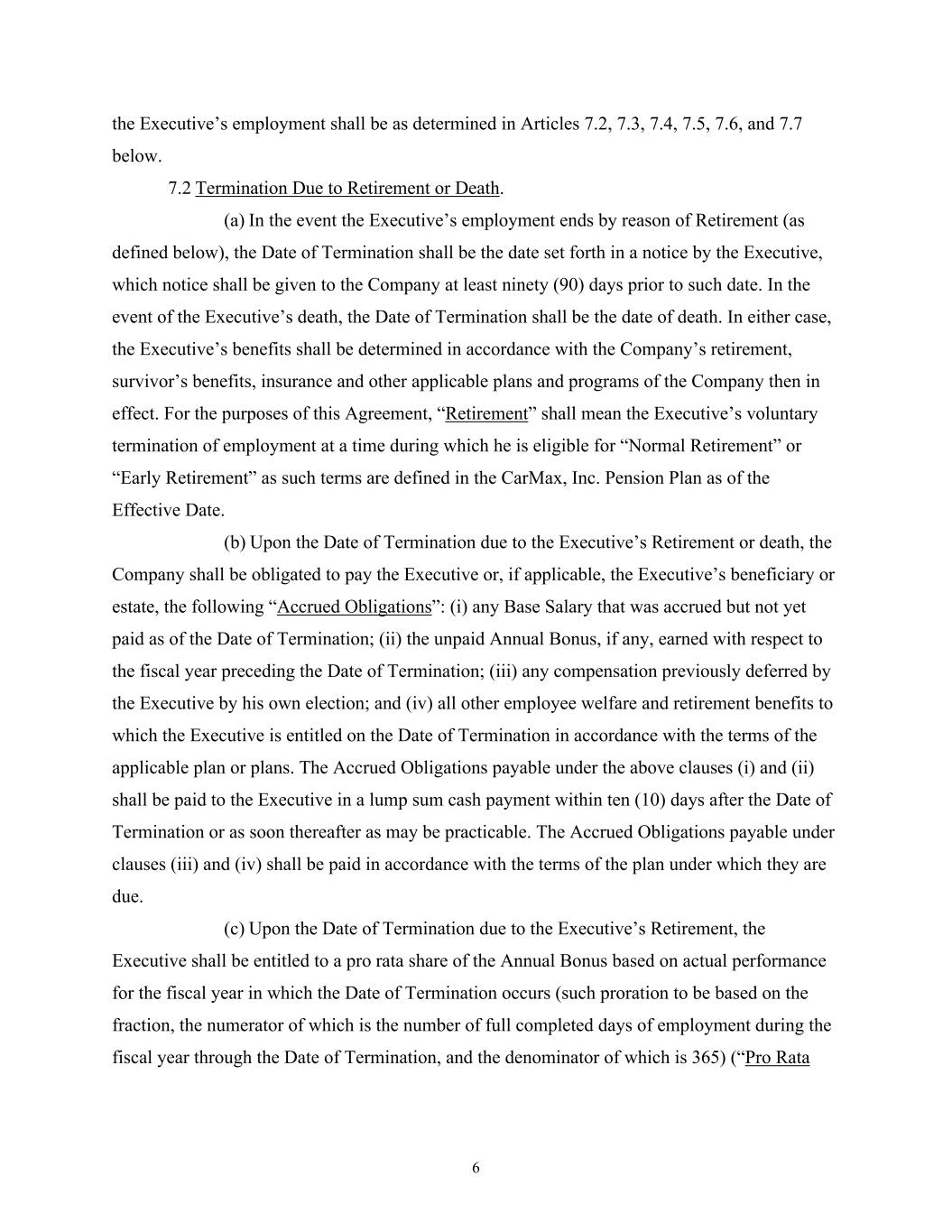 6 the Executive’s employment shall be as determined in Articles 7.2, 7.3, 7.4, 7.5, 7.6, and 7.7 below. 7.2 Termination Due to Retirement or Death. (a) In the event the Executive’s employment ends by reason of Retirement (as defined below), the Date of Termination shall be the date set forth in a notice by the Executive, which notice shall be given to the Company at least ninety (90) days prior to such date. In the event of the Executive’s death, the Date of Termination shall be the date of death. In either case, the Executive’s benefits shall be determined in accordance with the Company’s retirement, survivor’s benefits, insurance and other applicable plans and programs of the Company then in effect. For the purposes of this Agreement, “Retirement” shall mean the Executive’s voluntary termination of employment at a time during which he is eligible for “Normal Retirement” or “Early Retirement” as such terms are defined in the CarMax, Inc. Pension Plan as of the Effective Date. (b) Upon the Date of Termination due to the Executive’s Retirement or death, the Company shall be obligated to pay the Executive or, if applicable, the Executive’s beneficiary or estate, the following “Accrued Obligations”: (i) any Base Salary that was accrued but not yet paid as of the Date of Termination; (ii) the unpaid Annual Bonus, if any, earned with respect to the fiscal year preceding the Date of Termination; (iii) any compensation previously deferred by the Executive by his own election; and (iv) all other employee welfare and retirement benefits to which the Executive is entitled on the Date of Termination in accordance with the terms of the applicable plan or plans. The Accrued Obligations payable under the above clauses (i) and (ii) shall be paid to the Executive in a lump sum cash payment within ten (10) days after the Date of Termination or as soon thereafter as may be practicable. The Accrued Obligations payable under clauses (iii) and (iv) shall be paid in accordance with the terms of the plan under which they are due. (c) Upon the Date of Termination due to the Executive’s Retirement, the Executive shall be entitled to a pro rata share of the Annual Bonus based on actual performance for the fiscal year in which the Date of Termination occurs (such proration to be based on the fraction, the numerator of which is the number of full completed days of employment during the fiscal year through the Date of Termination, and the denominator of which is 365) (“Pro Rata