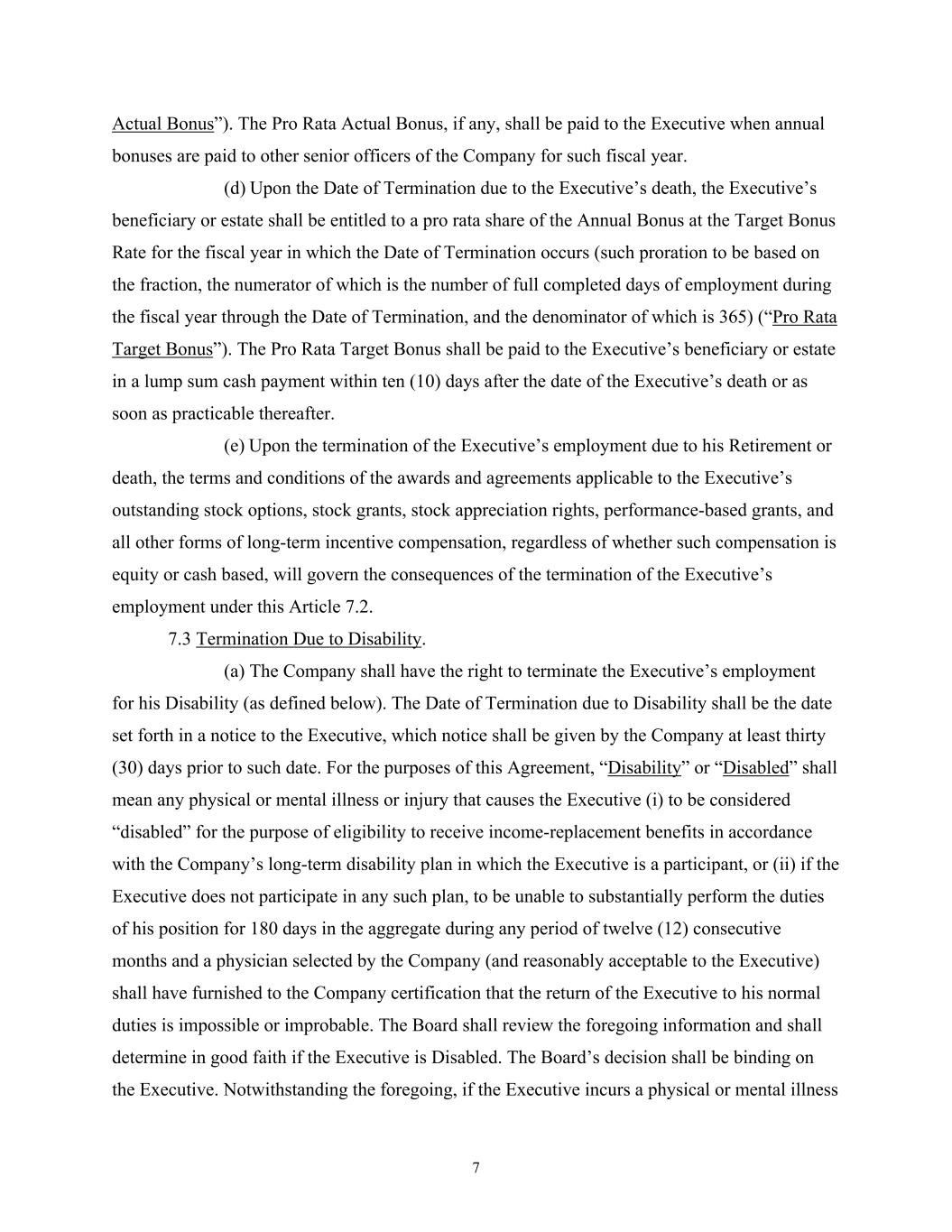 7 Actual Bonus”). The Pro Rata Actual Bonus, if any, shall be paid to the Executive when annual bonuses are paid to other senior officers of the Company for such fiscal year. (d) Upon the Date of Termination due to the Executive’s death, the Executive’s beneficiary or estate shall be entitled to a pro rata share of the Annual Bonus at the Target Bonus Rate for the fiscal year in which the Date of Termination occurs (such proration to be based on the fraction, the numerator of which is the number of full completed days of employment during the fiscal year through the Date of Termination, and the denominator of which is 365) (“Pro Rata Target Bonus”). The Pro Rata Target Bonus shall be paid to the Executive’s beneficiary or estate in a lump sum cash payment within ten (10) days after the date of the Executive’s death or as soon as practicable thereafter. (e) Upon the termination of the Executive’s employment due to his Retirement or death, the terms and conditions of the awards and agreements applicable to the Executive’s outstanding stock options, stock grants, stock appreciation rights, performance-based grants, and all other forms of long-term incentive compensation, regardless of whether such compensation is equity or cash based, will govern the consequences of the termination of the Executive’s employment under this Article 7.2. 7.3 Termination Due to Disability. (a) The Company shall have the right to terminate the Executive’s employment for his Disability (as defined below). The Date of Termination due to Disability shall be the date set forth in a notice to the Executive, which notice shall be given by the Company at least thirty (30) days prior to such date. For the purposes of this Agreement, “Disability” or “Disabled” shall mean any physical or mental illness or injury that causes the Executive (i) to be considered “disabled” for the purpose of eligibility to receive income-replacement benefits in accordance with the Company’s long-term disability plan in which the Executive is a participant, or (ii) if the Executive does not participate in any such plan, to be unable to substantially perform the duties of his position for 180 days in the aggregate during any period of twelve (12) consecutive months and a physician selected by the Company (and reasonably acceptable to the Executive) shall have furnished to the Company certification that the return of the Executive to his normal duties is impossible or improbable. The Board shall review the foregoing information and shall determine in good faith if the Executive is Disabled. The Board’s decision shall be binding on the Executive. Notwithstanding the foregoing, if the Executive incurs a physical or mental illness