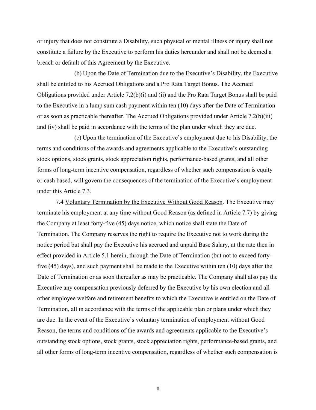 8 or injury that does not constitute a Disability, such physical or mental illness or injury shall not constitute a failure by the Executive to perform his duties hereunder and shall not be deemed a breach or default of this Agreement by the Executive. (b) Upon the Date of Termination due to the Executive’s Disability, the Executive shall be entitled to his Accrued Obligations and a Pro Rata Target Bonus. The Accrued Obligations provided under Article 7.2(b)(i) and (ii) and the Pro Rata Target Bonus shall be paid to the Executive in a lump sum cash payment within ten (10) days after the Date of Termination or as soon as practicable thereafter. The Accrued Obligations provided under Article 7.2(b)(iii) and (iv) shall be paid in accordance with the terms of the plan under which they are due. (c) Upon the termination of the Executive’s employment due to his Disability, the terms and conditions of the awards and agreements applicable to the Executive’s outstanding stock options, stock grants, stock appreciation rights, performance-based grants, and all other forms of long-term incentive compensation, regardless of whether such compensation is equity or cash based, will govern the consequences of the termination of the Executive’s employment under this Article 7.3. 7.4 Voluntary Termination by the Executive Without Good Reason. The Executive may terminate his employment at any time without Good Reason (as defined in Article 7.7) by giving the Company at least forty-five (45) days notice, which notice shall state the Date of Termination. The Company reserves the right to require the Executive not to work during the notice period but shall pay the Executive his accrued and unpaid Base Salary, at the rate then in effect provided in Article 5.1 herein, through the Date of Termination (but not to exceed forty- five (45) days), and such payment shall be made to the Executive within ten (10) days after the Date of Termination or as soon thereafter as may be practicable. The Company shall also pay the Executive any compensation previously deferred by the Executive by his own election and all other employee welfare and retirement benefits to which the Executive is entitled on the Date of Termination, all in accordance with the terms of the applicable plan or plans under which they are due. In the event of the Executive’s voluntary termination of employment without Good Reason, the terms and conditions of the awards and agreements applicable to the Executive’s outstanding stock options, stock grants, stock appreciation rights, performance-based grants, and all other forms of long-term incentive compensation, regardless of whether such compensation is
