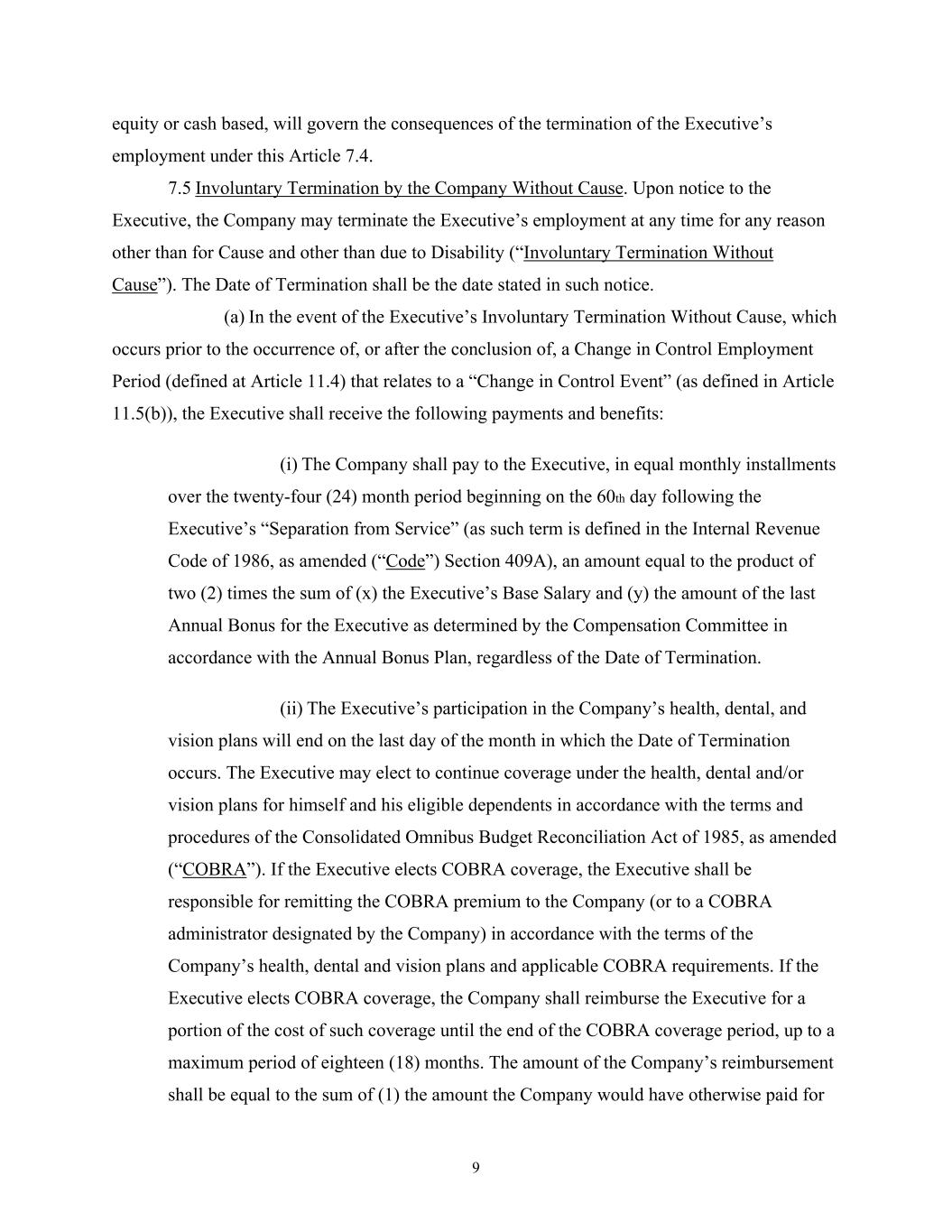 9 equity or cash based, will govern the consequences of the termination of the Executive’s employment under this Article 7.4. 7.5 Involuntary Termination by the Company Without Cause. Upon notice to the Executive, the Company may terminate the Executive’s employment at any time for any reason other than for Cause and other than due to Disability (“Involuntary Termination Without Cause”). The Date of Termination shall be the date stated in such notice. (a) In the event of the Executive’s Involuntary Termination Without Cause, which occurs prior to the occurrence of, or after the conclusion of, a Change in Control Employment Period (defined at Article 11.4) that relates to a “Change in Control Event” (as defined in Article 11.5(b)), the Executive shall receive the following payments and benefits: (i) The Company shall pay to the Executive, in equal monthly installments over the twenty-four (24) month period beginning on the 60th day following the Executive’s “Separation from Service” (as such term is defined in the Internal Revenue Code of 1986, as amended (“Code”) Section 409A), an amount equal to the product of two (2) times the sum of (x) the Executive’s Base Salary and (y) the amount of the last Annual Bonus for the Executive as determined by the Compensation Committee in accordance with the Annual Bonus Plan, regardless of the Date of Termination. (ii) The Executive’s participation in the Company’s health, dental, and vision plans will end on the last day of the month in which the Date of Termination occurs. The Executive may elect to continue coverage under the health, dental and/or vision plans for himself and his eligible dependents in accordance with the terms and procedures of the Consolidated Omnibus Budget Reconciliation Act of 1985, as amended (“COBRA”). If the Executive elects COBRA coverage, the Executive shall be responsible for remitting the COBRA premium to the Company (or to a COBRA administrator designated by the Company) in accordance with the terms of the Company’s health, dental and vision plans and applicable COBRA requirements. If the Executive elects COBRA coverage, the Company shall reimburse the Executive for a portion of the cost of such coverage until the end of the COBRA coverage period, up to a maximum period of eighteen (18) months. The amount of the Company’s reimbursement shall be equal to the sum of (1) the amount the Company would have otherwise paid for