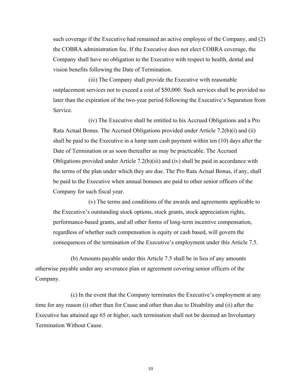 10 such coverage if the Executive had remained an active employee of the Company, and (2) the COBRA administration fee. If the Executive does not elect COBRA coverage, the Company shall have no obligation to the Executive with respect to health, dental and vision benefits following the Date of Termination. (iii) The Company shall provide the Executive with reasonable outplacement services not to exceed a cost of $50,000. Such services shall be provided no later than the expiration of the two-year period following the Executive’s Separation from Service. (iv) The Executive shall be entitled to his Accrued Obligations and a Pro Rata Actual Bonus. The Accrued Obligations provided under Article 7.2(b)(i) and (ii) shall be paid to the Executive in a lump sum cash payment within ten (10) days after the Date of Termination or as soon thereafter as may be practicable. The Accrued Obligations provided under Article 7.2(b)(iii) and (iv) shall be paid in accordance with the terms of the plan under which they are due. The Pro Rata Actual Bonus, if any, shall be paid to the Executive when annual bonuses are paid to other senior officers of the Company for such fiscal year. (v) The terms and conditions of the awards and agreements applicable to the Executive’s outstanding stock options, stock grants, stock appreciation rights, performance-based grants, and all other forms of long-term incentive compensation, regardless of whether such compensation is equity or cash based, will govern the consequences of the termination of the Executive’s employment under this Article 7.5. (b) Amounts payable under this Article 7.5 shall be in lieu of any amounts otherwise payable under any severance plan or agreement covering senior officers of the Company. (c) In the event that the Company terminates the Executive’s employment at any time for any reason (i) other than for Cause and other than due to Disability and (ii) after the Executive has attained age 65 or higher, such termination shall not be deemed an Involuntary Termination Without Cause.