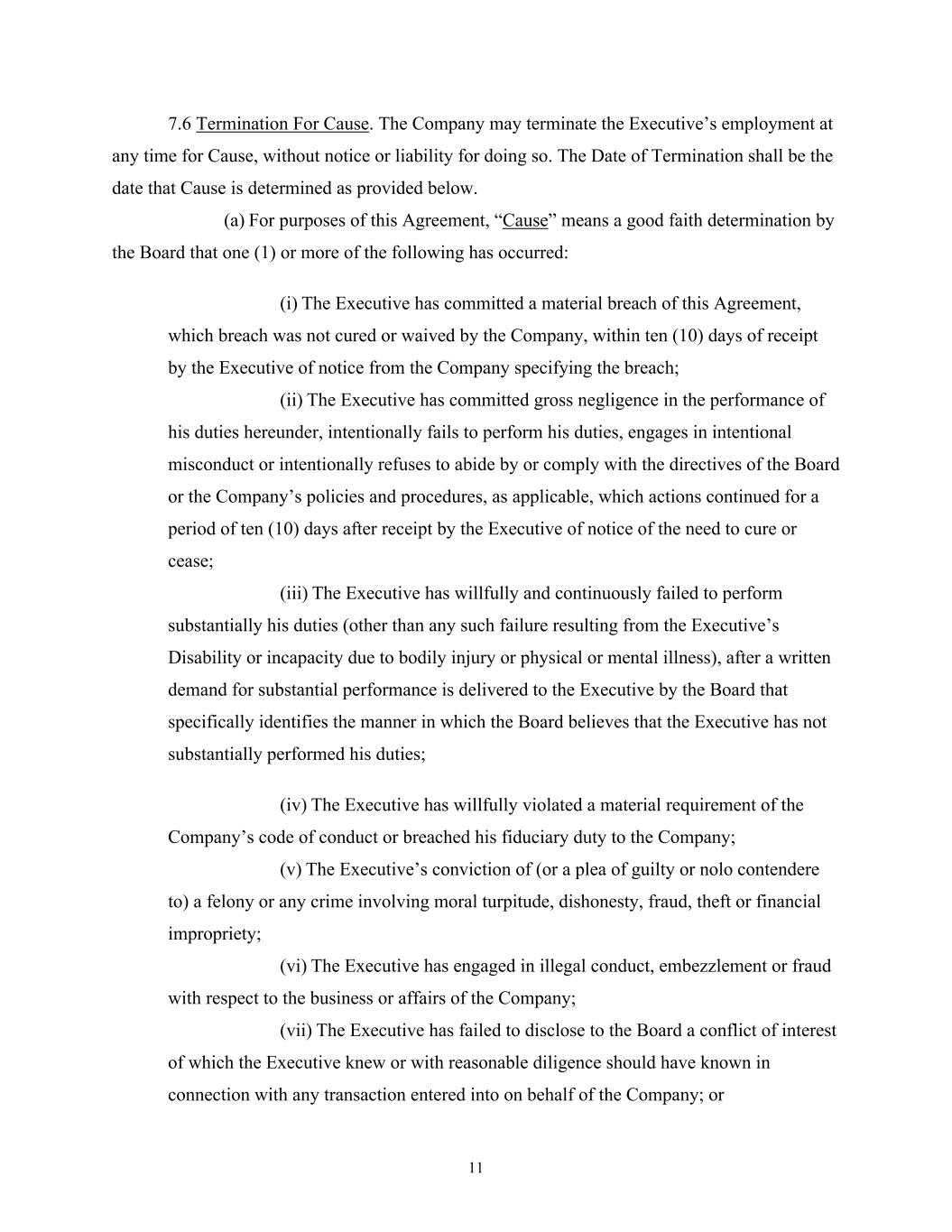 11 7.6 Termination For Cause. The Company may terminate the Executive’s employment at any time for Cause, without notice or liability for doing so. The Date of Termination shall be the date that Cause is determined as provided below. (a) For purposes of this Agreement, “Cause” means a good faith determination by the Board that one (1) or more of the following has occurred: (i) The Executive has committed a material breach of this Agreement, which breach was not cured or waived by the Company, within ten (10) days of receipt by the Executive of notice from the Company specifying the breach; (ii) The Executive has committed gross negligence in the performance of his duties hereunder, intentionally fails to perform his duties, engages in intentional misconduct or intentionally refuses to abide by or comply with the directives of the Board or the Company’s policies and procedures, as applicable, which actions continued for a period of ten (10) days after receipt by the Executive of notice of the need to cure or cease; (iii) The Executive has willfully and continuously failed to perform substantially his duties (other than any such failure resulting from the Executive’s Disability or incapacity due to bodily injury or physical or mental illness), after a written demand for substantial performance is delivered to the Executive by the Board that specifically identifies the manner in which the Board believes that the Executive has not substantially performed his duties; (iv) The Executive has willfully violated a material requirement of the Company’s code of conduct or breached his fiduciary duty to the Company; (v) The Executive’s conviction of (or a plea of guilty or nolo contendere to) a felony or any crime involving moral turpitude, dishonesty, fraud, theft or financial impropriety; (vi) The Executive has engaged in illegal conduct, embezzlement or fraud with respect to the business or affairs of the Company; (vii) The Executive has failed to disclose to the Board a conflict of interest of which the Executive knew or with reasonable diligence should have known in connection with any transaction entered into on behalf of the Company; or