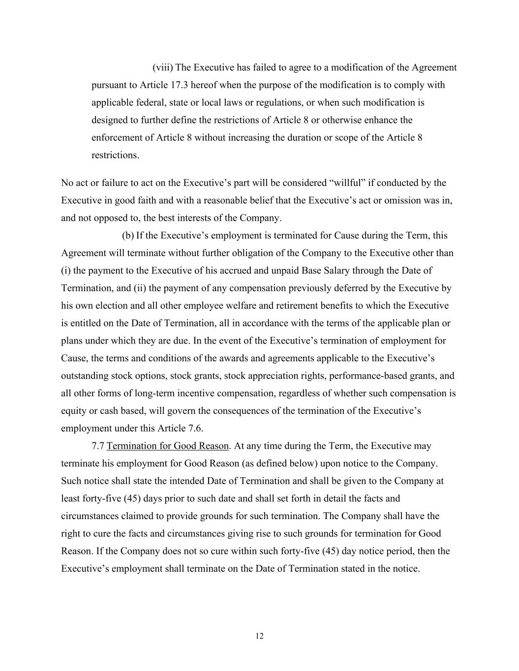 12 (viii) The Executive has failed to agree to a modification of the Agreement pursuant to Article 17.3 hereof when the purpose of the modification is to comply with applicable federal, state or local laws or regulations, or when such modification is designed to further define the restrictions of Article 8 or otherwise enhance the enforcement of Article 8 without increasing the duration or scope of the Article 8 restrictions. No act or failure to act on the Executive’s part will be considered “willful” if conducted by the Executive in good faith and with a reasonable belief that the Executive’s act or omission was in, and not opposed to, the best interests of the Company. (b) If the Executive’s employment is terminated for Cause during the Term, this Agreement will terminate without further obligation of the Company to the Executive other than (i) the payment to the Executive of his accrued and unpaid Base Salary through the Date of Termination, and (ii) the payment of any compensation previously deferred by the Executive by his own election and all other employee welfare and retirement benefits to which the Executive is entitled on the Date of Termination, all in accordance with the terms of the applicable plan or plans under which they are due. In the event of the Executive’s termination of employment for Cause, the terms and conditions of the awards and agreements applicable to the Executive’s outstanding stock options, stock grants, stock appreciation rights, performance-based grants, and all other forms of long-term incentive compensation, regardless of whether such compensation is equity or cash based, will govern the consequences of the termination of the Executive’s employment under this Article 7.6. 7.7 Termination for Good Reason. At any time during the Term, the Executive may terminate his employment for Good Reason (as defined below) upon notice to the Company. Such notice shall state the intended Date of Termination and shall be given to the Company at least forty-five (45) days prior to such date and shall set forth in detail the facts and circumstances claimed to provide grounds for such termination. The Company shall have the right to cure the facts and circumstances giving rise to such grounds for termination for Good Reason. If the Company does not so cure within such forty-five (45) day notice period, then the Executive’s employment shall terminate on the Date of Termination stated in the notice.