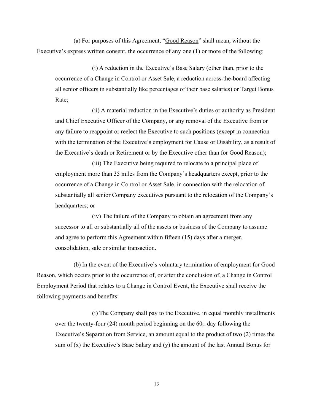 13 (a) For purposes of this Agreement, “Good Reason” shall mean, without the Executive’s express written consent, the occurrence of any one (1) or more of the following: (i) A reduction in the Executive’s Base Salary (other than, prior to the occurrence of a Change in Control or Asset Sale, a reduction across-the-board affecting all senior officers in substantially like percentages of their base salaries) or Target Bonus Rate; (ii) A material reduction in the Executive’s duties or authority as President and Chief Executive Officer of the Company, or any removal of the Executive from or any failure to reappoint or reelect the Executive to such positions (except in connection with the termination of the Executive’s employment for Cause or Disability, as a result of the Executive’s death or Retirement or by the Executive other than for Good Reason); (iii) The Executive being required to relocate to a principal place of employment more than 35 miles from the Company’s headquarters except, prior to the occurrence of a Change in Control or Asset Sale, in connection with the relocation of substantially all senior Company executives pursuant to the relocation of the Company’s headquarters; or (iv) The failure of the Company to obtain an agreement from any successor to all or substantially all of the assets or business of the Company to assume and agree to perform this Agreement within fifteen (15) days after a merger, consolidation, sale or similar transaction. (b) In the event of the Executive’s voluntary termination of employment for Good Reason, which occurs prior to the occurrence of, or after the conclusion of, a Change in Control Employment Period that relates to a Change in Control Event, the Executive shall receive the following payments and benefits: (i) The Company shall pay to the Executive, in equal monthly installments over the twenty-four (24) month period beginning on the 60th day following the Executive’s Separation from Service, an amount equal to the product of two (2) times the sum of (x) the Executive’s Base Salary and (y) the amount of the last Annual Bonus for