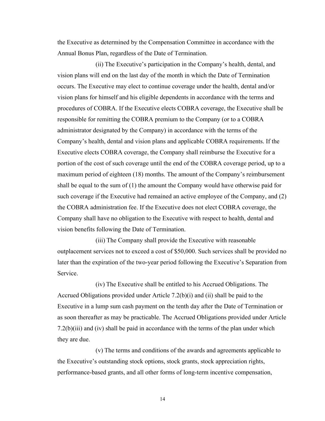 14 the Executive as determined by the Compensation Committee in accordance with the Annual Bonus Plan, regardless of the Date of Termination. (ii) The Executive’s participation in the Company’s health, dental, and vision plans will end on the last day of the month in which the Date of Termination occurs. The Executive may elect to continue coverage under the health, dental and/or vision plans for himself and his eligible dependents in accordance with the terms and procedures of COBRA. If the Executive elects COBRA coverage, the Executive shall be responsible for remitting the COBRA premium to the Company (or to a COBRA administrator designated by the Company) in accordance with the terms of the Company’s health, dental and vision plans and applicable COBRA requirements. If the Executive elects COBRA coverage, the Company shall reimburse the Executive for a portion of the cost of such coverage until the end of the COBRA coverage period, up to a maximum period of eighteen (18) months. The amount of the Company’s reimbursement shall be equal to the sum of (1) the amount the Company would have otherwise paid for such coverage if the Executive had remained an active employee of the Company, and (2) the COBRA administration fee. If the Executive does not elect COBRA coverage, the Company shall have no obligation to the Executive with respect to health, dental and vision benefits following the Date of Termination. (iii) The Company shall provide the Executive with reasonable outplacement services not to exceed a cost of $50,000. Such services shall be provided no later than the expiration of the two-year period following the Executive’s Separation from Service. (iv) The Executive shall be entitled to his Accrued Obligations. The Accrued Obligations provided under Article 7.2(b)(i) and (ii) shall be paid to the Executive in a lump sum cash payment on the tenth day after the Date of Termination or as soon thereafter as may be practicable. The Accrued Obligations provided under Article 7.2(b)(iii) and (iv) shall be paid in accordance with the terms of the plan under which they are due. (v) The terms and conditions of the awards and agreements applicable to the Executive’s outstanding stock options, stock grants, stock appreciation rights, performance-based grants, and all other forms of long-term incentive compensation,