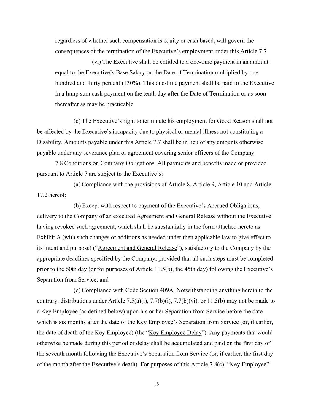 15 regardless of whether such compensation is equity or cash based, will govern the consequences of the termination of the Executive’s employment under this Article 7.7. (vi) The Executive shall be entitled to a one-time payment in an amount equal to the Executive’s Base Salary on the Date of Termination multiplied by one hundred and thirty percent (130%). This one-time payment shall be paid to the Executive in a lump sum cash payment on the tenth day after the Date of Termination or as soon thereafter as may be practicable. (c) The Executive’s right to terminate his employment for Good Reason shall not be affected by the Executive’s incapacity due to physical or mental illness not constituting a Disability. Amounts payable under this Article 7.7 shall be in lieu of any amounts otherwise payable under any severance plan or agreement covering senior officers of the Company. 7.8 Conditions on Company Obligations. All payments and benefits made or provided pursuant to Article 7 are subject to the Executive’s: (a) Compliance with the provisions of Article 8, Article 9, Article 10 and Article 17.2 hereof; (b) Except with respect to payment of the Executive’s Accrued Obligations, delivery to the Company of an executed Agreement and General Release without the Executive having revoked such agreement, which shall be substantially in the form attached hereto as Exhibit A (with such changes or additions as needed under then applicable law to give effect to its intent and purpose) (“Agreement and General Release”), satisfactory to the Company by the appropriate deadlines specified by the Company, provided that all such steps must be completed prior to the 60th day (or for purposes of Article 11.5(b), the 45th day) following the Executive’s Separation from Service; and (c) Compliance with Code Section 409A. Notwithstanding anything herein to the contrary, distributions under Article 7.5(a)(i), 7.7(b)(i), 7.7(b)(vi), or 11.5(b) may not be made to a Key Employee (as defined below) upon his or her Separation from Service before the date which is six months after the date of the Key Employee’s Separation from Service (or, if earlier, the date of death of the Key Employee) (the “Key Employee Delay”). Any payments that would otherwise be made during this period of delay shall be accumulated and paid on the first day of the seventh month following the Executive’s Separation from Service (or, if earlier, the first day of the month after the Executive’s death). For purposes of this Article 7.8(c), “Key Employee”