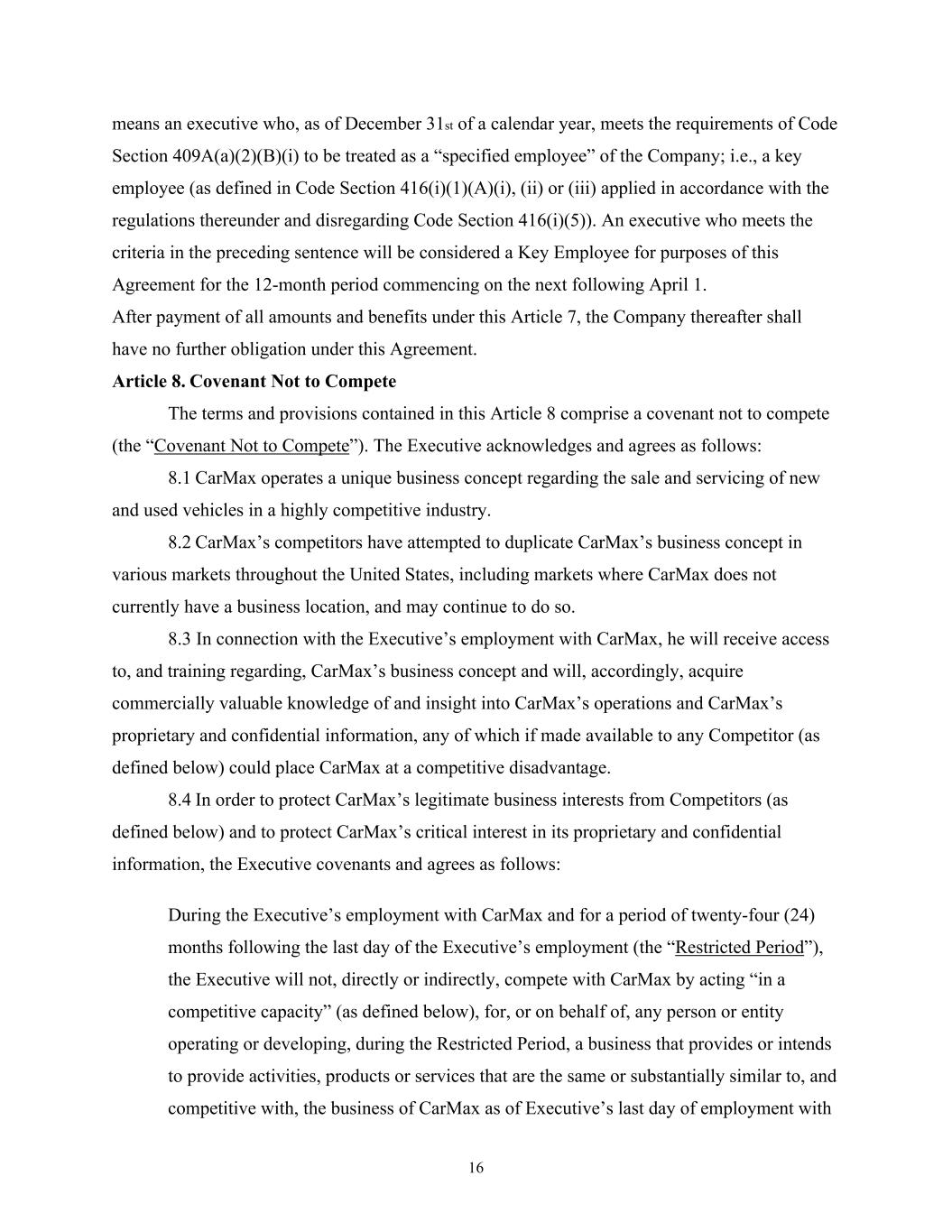 16 means an executive who, as of December 31st of a calendar year, meets the requirements of Code Section 409A(a)(2)(B)(i) to be treated as a “specified employee” of the Company; i.e., a key employee (as defined in Code Section 416(i)(1)(A)(i), (ii) or (iii) applied in accordance with the regulations thereunder and disregarding Code Section 416(i)(5)). An executive who meets the criteria in the preceding sentence will be considered a Key Employee for purposes of this Agreement for the 12-month period commencing on the next following April 1. After payment of all amounts and benefits under this Article 7, the Company thereafter shall have no further obligation under this Agreement. Article 8. Covenant Not to Compete The terms and provisions contained in this Article 8 comprise a covenant not to compete (the “Covenant Not to Compete”). The Executive acknowledges and agrees as follows: 8.1 CarMax operates a unique business concept regarding the sale and servicing of new and used vehicles in a highly competitive industry. 8.2 CarMax’s competitors have attempted to duplicate CarMax’s business concept in various markets throughout the United States, including markets where CarMax does not currently have a business location, and may continue to do so. 8.3 In connection with the Executive’s employment with CarMax, he will receive access to, and training regarding, CarMax’s business concept and will, accordingly, acquire commercially valuable knowledge of and insight into CarMax’s operations and CarMax’s proprietary and confidential information, any of which if made available to any Competitor (as defined below) could place CarMax at a competitive disadvantage. 8.4 In order to protect CarMax’s legitimate business interests from Competitors (as defined below) and to protect CarMax’s critical interest in its proprietary and confidential information, the Executive covenants and agrees as follows: During the Executive’s employment with CarMax and for a period of twenty-four (24) months following the last day of the Executive’s employment (the “Restricted Period”), the Executive will not, directly or indirectly, compete with CarMax by acting “in a competitive capacity” (as defined below), for, or on behalf of, any person or entity operating or developing, during the Restricted Period, a business that provides or intends to provide activities, products or services that are the same or substantially similar to, and competitive with, the business of CarMax as of Executive’s last day of employment with