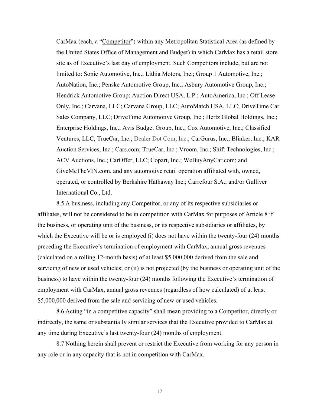 17 CarMax (each, a “Competitor”) within any Metropolitan Statistical Area (as defined by the United States Office of Management and Budget) in which CarMax has a retail store site as of Executive’s last day of employment. Such Competitors include, but are not limited to: Sonic Automotive, Inc.; Lithia Motors, Inc.; Group 1 Automotive, Inc.; AutoNation, Inc.; Penske Automotive Group, Inc.; Asbury Automotive Group, Inc.; Hendrick Automotive Group; Auction Direct USA, L.P.; AutoAmerica, Inc.; Off Lease Only, Inc.; Carvana, LLC; Carvana Group, LLC; AutoMatch USA, LLC; DriveTime Car Sales Company, LLC; DriveTime Automotive Group, Inc.; Hertz Global Holdings, Inc.; Enterprise Holdings, Inc.; Avis Budget Group, Inc.; Cox Automotive, Inc.; Classified Ventures, LLC; TrueCar, Inc.; Dealer Dot Com, Inc.; CarGurus, Inc.; Blinker, Inc.; KAR Auction Services, Inc.; Cars.com; TrueCar, Inc.; Vroom, Inc.; Shift Technologies, Inc.; ACV Auctions, Inc.; CarOffer, LLC; Copart, Inc.; WeBuyAnyCar.com; and GiveMeTheVIN.com, and any automotive retail operation affiliated with, owned, operated, or controlled by Berkshire Hathaway Inc.; Carrefour S.A.; and/or Gulliver International Co., Ltd. 8.5 A business, including any Competitor, or any of its respective subsidiaries or affiliates, will not be considered to be in competition with CarMax for purposes of Article 8 if the business, or operating unit of the business, or its respective subsidiaries or affiliates, by which the Executive will be or is employed (i) does not have within the twenty-four (24) months preceding the Executive’s termination of employment with CarMax, annual gross revenues (calculated on a rolling 12-month basis) of at least $5,000,000 derived from the sale and servicing of new or used vehicles; or (ii) is not projected (by the business or operating unit of the business) to have within the twenty-four (24) months following the Executive’s termination of employment with CarMax, annual gross revenues (regardless of how calculated) of at least $5,000,000 derived from the sale and servicing of new or used vehicles. 8.6 Acting “in a competitive capacity” shall mean providing to a Competitor, directly or indirectly, the same or substantially similar services that the Executive provided to CarMax at any time during Executive’s last twenty-four (24) months of employment. 8.7 Nothing herein shall prevent or restrict the Executive from working for any person in any role or in any capacity that is not in competition with CarMax.