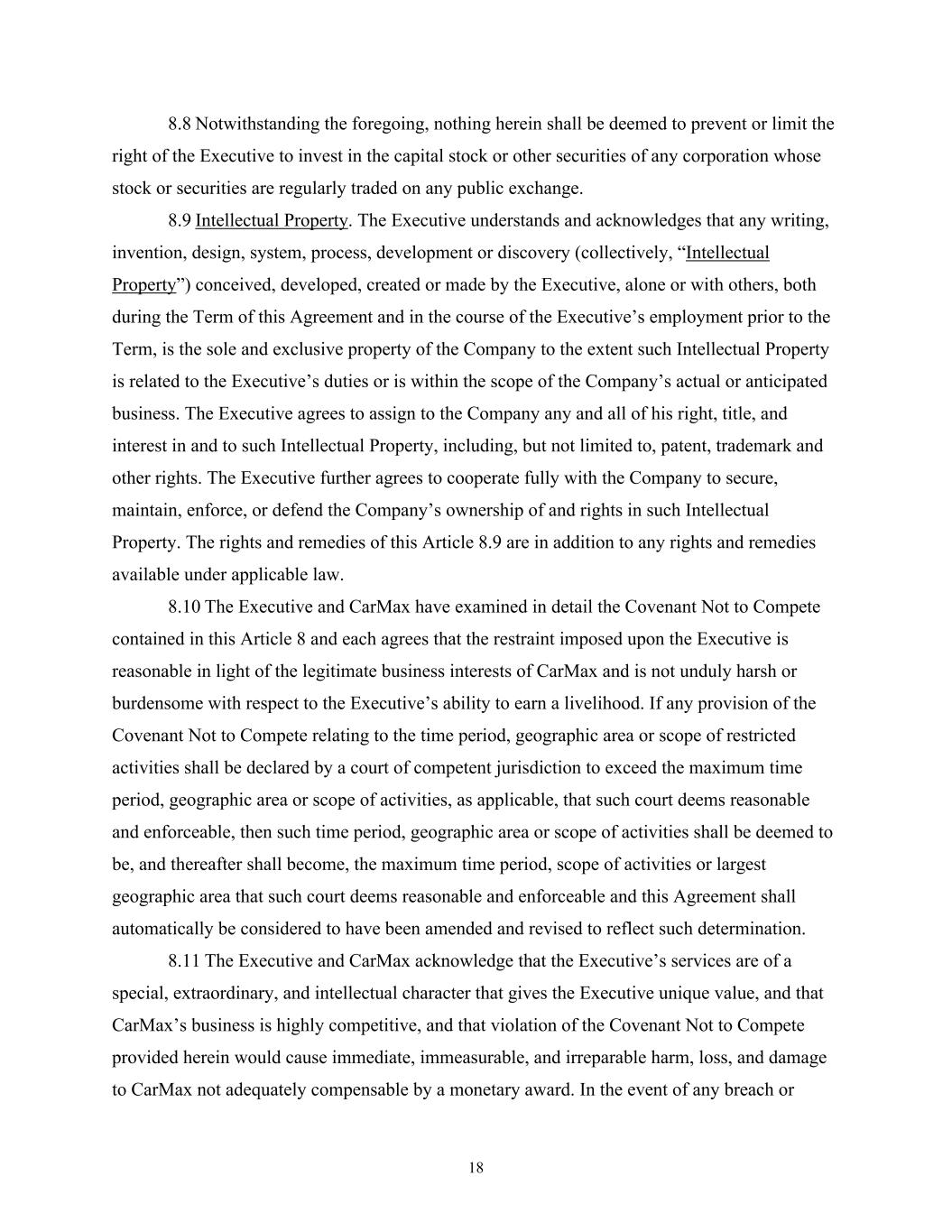 18 8.8 Notwithstanding the foregoing, nothing herein shall be deemed to prevent or limit the right of the Executive to invest in the capital stock or other securities of any corporation whose stock or securities are regularly traded on any public exchange. 8.9 Intellectual Property. The Executive understands and acknowledges that any writing, invention, design, system, process, development or discovery (collectively, “Intellectual Property”) conceived, developed, created or made by the Executive, alone or with others, both during the Term of this Agreement and in the course of the Executive’s employment prior to the Term, is the sole and exclusive property of the Company to the extent such Intellectual Property is related to the Executive’s duties or is within the scope of the Company’s actual or anticipated business. The Executive agrees to assign to the Company any and all of his right, title, and interest in and to such Intellectual Property, including, but not limited to, patent, trademark and other rights. The Executive further agrees to cooperate fully with the Company to secure, maintain, enforce, or defend the Company’s ownership of and rights in such Intellectual Property. The rights and remedies of this Article 8.9 are in addition to any rights and remedies available under applicable law. 8.10 The Executive and CarMax have examined in detail the Covenant Not to Compete contained in this Article 8 and each agrees that the restraint imposed upon the Executive is reasonable in light of the legitimate business interests of CarMax and is not unduly harsh or burdensome with respect to the Executive’s ability to earn a livelihood. If any provision of the Covenant Not to Compete relating to the time period, geographic area or scope of restricted activities shall be declared by a court of competent jurisdiction to exceed the maximum time period, geographic area or scope of activities, as applicable, that such court deems reasonable and enforceable, then such time period, geographic area or scope of activities shall be deemed to be, and thereafter shall become, the maximum time period, scope of activities or largest geographic area that such court deems reasonable and enforceable and this Agreement shall automatically be considered to have been amended and revised to reflect such determination. 8.11 The Executive and CarMax acknowledge that the Executive’s services are of a special, extraordinary, and intellectual character that gives the Executive unique value, and that CarMax’s business is highly competitive, and that violation of the Covenant Not to Compete provided herein would cause immediate, immeasurable, and irreparable harm, loss, and damage to CarMax not adequately compensable by a monetary award. In the event of any breach or
