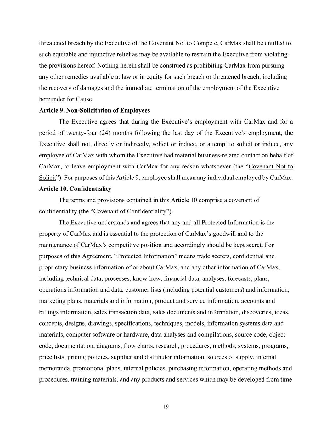 19 threatened breach by the Executive of the Covenant Not to Compete, CarMax shall be entitled to such equitable and injunctive relief as may be available to restrain the Executive from violating the provisions hereof. Nothing herein shall be construed as prohibiting CarMax from pursuing any other remedies available at law or in equity for such breach or threatened breach, including the recovery of damages and the immediate termination of the employment of the Executive hereunder for Cause. Article 9. Non-Solicitation of Employees The Executive agrees that during the Executive’s employment with CarMax and for a period of twenty-four (24) months following the last day of the Executive’s employment, the Executive shall not, directly or indirectly, solicit or induce, or attempt to solicit or induce, any employee of CarMax with whom the Executive had material business-related contact on behalf of CarMax, to leave employment with CarMax for any reason whatsoever (the “Covenant Not to Solicit”). For purposes of this Article 9, employee shall mean any individual employed by CarMax. Article 10. Confidentiality The terms and provisions contained in this Article 10 comprise a covenant of confidentiality (the “Covenant of Confidentiality”). The Executive understands and agrees that any and all Protected Information is the property of CarMax and is essential to the protection of CarMax’s goodwill and to the maintenance of CarMax’s competitive position and accordingly should be kept secret. For purposes of this Agreement, “Protected Information” means trade secrets, confidential and proprietary business information of or about CarMax, and any other information of CarMax, including technical data, processes, know-how, financial data, analyses, forecasts, plans, operations information and data, customer lists (including potential customers) and information, marketing plans, materials and information, product and service information, accounts and billings information, sales transaction data, sales documents and information, discoveries, ideas, concepts, designs, drawings, specifications, techniques, models, information systems data and materials, computer software or hardware, data analyses and compilations, source code, object code, documentation, diagrams, flow charts, research, procedures, methods, systems, programs, price lists, pricing policies, supplier and distributor information, sources of supply, internal memoranda, promotional plans, internal policies, purchasing information, operating methods and procedures, training materials, and any products and services which may be developed from time