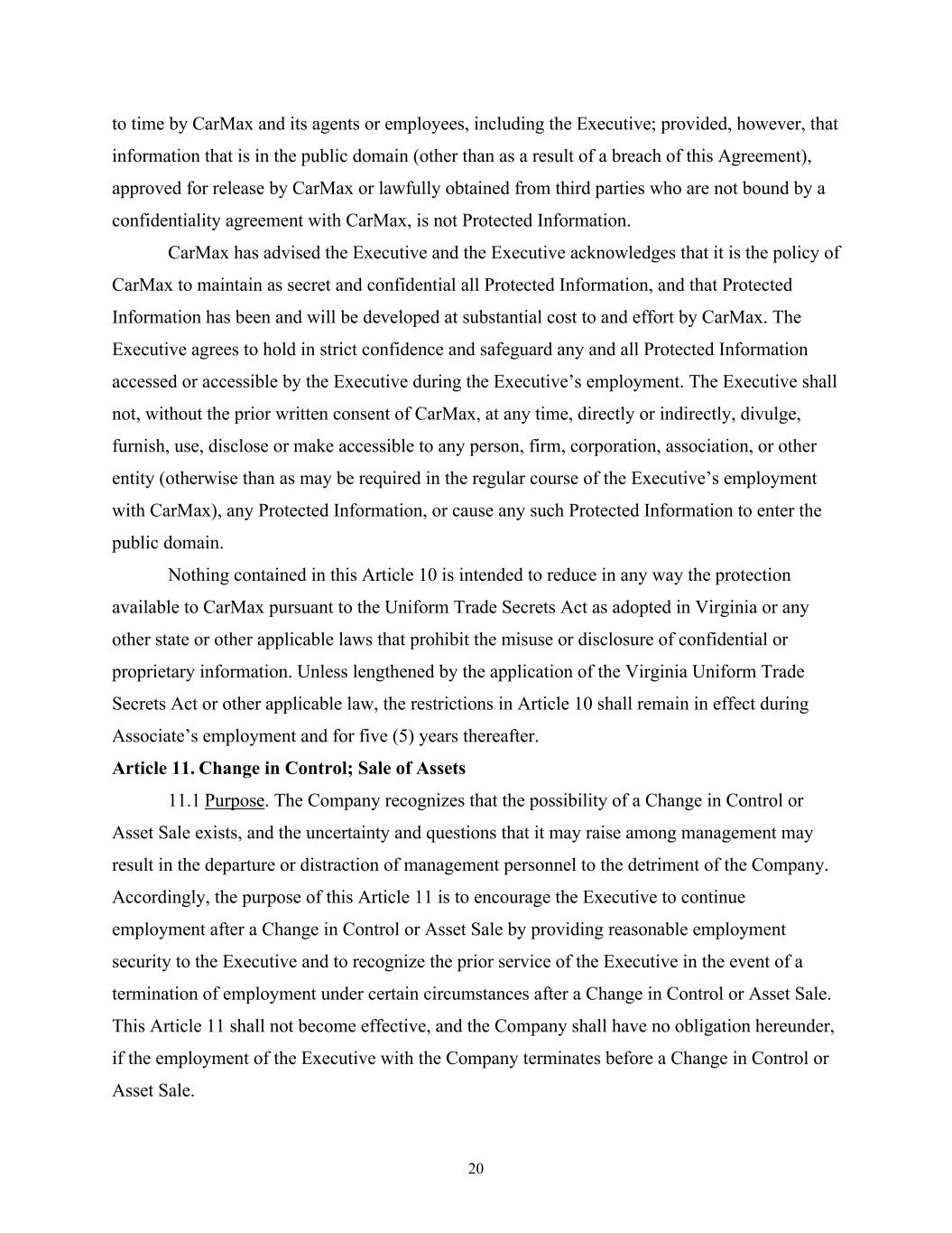 20 to time by CarMax and its agents or employees, including the Executive; provided, however, that information that is in the public domain (other than as a result of a breach of this Agreement), approved for release by CarMax or lawfully obtained from third parties who are not bound by a confidentiality agreement with CarMax, is not Protected Information. CarMax has advised the Executive and the Executive acknowledges that it is the policy of CarMax to maintain as secret and confidential all Protected Information, and that Protected Information has been and will be developed at substantial cost to and effort by CarMax. The Executive agrees to hold in strict confidence and safeguard any and all Protected Information accessed or accessible by the Executive during the Executive’s employment. The Executive shall not, without the prior written consent of CarMax, at any time, directly or indirectly, divulge, furnish, use, disclose or make accessible to any person, firm, corporation, association, or other entity (otherwise than as may be required in the regular course of the Executive’s employment with CarMax), any Protected Information, or cause any such Protected Information to enter the public domain. Nothing contained in this Article 10 is intended to reduce in any way the protection available to CarMax pursuant to the Uniform Trade Secrets Act as adopted in Virginia or any other state or other applicable laws that prohibit the misuse or disclosure of confidential or proprietary information. Unless lengthened by the application of the Virginia Uniform Trade Secrets Act or other applicable law, the restrictions in Article 10 shall remain in effect during Associate’s employment and for five (5) years thereafter. Article 11. Change in Control; Sale of Assets 11.1 Purpose. The Company recognizes that the possibility of a Change in Control or Asset Sale exists, and the uncertainty and questions that it may raise among management may result in the departure or distraction of management personnel to the detriment of the Company. Accordingly, the purpose of this Article 11 is to encourage the Executive to continue employment after a Change in Control or Asset Sale by providing reasonable employment security to the Executive and to recognize the prior service of the Executive in the event of a termination of employment under certain circumstances after a Change in Control or Asset Sale. This Article 11 shall not become effective, and the Company shall have no obligation hereunder, if the employment of the Executive with the Company terminates before a Change in Control or Asset Sale.