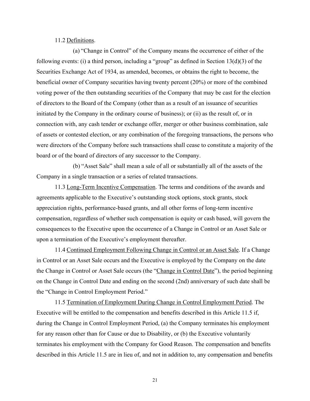 21 11.2 Definitions. (a) “Change in Control” of the Company means the occurrence of either of the following events: (i) a third person, including a “group” as defined in Section 13(d)(3) of the Securities Exchange Act of 1934, as amended, becomes, or obtains the right to become, the beneficial owner of Company securities having twenty percent (20%) or more of the combined voting power of the then outstanding securities of the Company that may be cast for the election of directors to the Board of the Company (other than as a result of an issuance of securities initiated by the Company in the ordinary course of business); or (ii) as the result of, or in connection with, any cash tender or exchange offer, merger or other business combination, sale of assets or contested election, or any combination of the foregoing transactions, the persons who were directors of the Company before such transactions shall cease to constitute a majority of the board or of the board of directors of any successor to the Company. (b) “Asset Sale” shall mean a sale of all or substantially all of the assets of the Company in a single transaction or a series of related transactions. 11.3 Long-Term Incentive Compensation. The terms and conditions of the awards and agreements applicable to the Executive’s outstanding stock options, stock grants, stock appreciation rights, performance-based grants, and all other forms of long-term incentive compensation, regardless of whether such compensation is equity or cash based, will govern the consequences to the Executive upon the occurrence of a Change in Control or an Asset Sale or upon a termination of the Executive’s employment thereafter. 11.4 Continued Employment Following Change in Control or an Asset Sale. If a Change in Control or an Asset Sale occurs and the Executive is employed by the Company on the date the Change in Control or Asset Sale occurs (the “Change in Control Date”), the period beginning on the Change in Control Date and ending on the second (2nd) anniversary of such date shall be the “Change in Control Employment Period.” 11.5 Termination of Employment During Change in Control Employment Period. The Executive will be entitled to the compensation and benefits described in this Article 11.5 if, during the Change in Control Employment Period, (a) the Company terminates his employment for any reason other than for Cause or due to Disability, or (b) the Executive voluntarily terminates his employment with the Company for Good Reason. The compensation and benefits described in this Article 11.5 are in lieu of, and not in addition to, any compensation and benefits