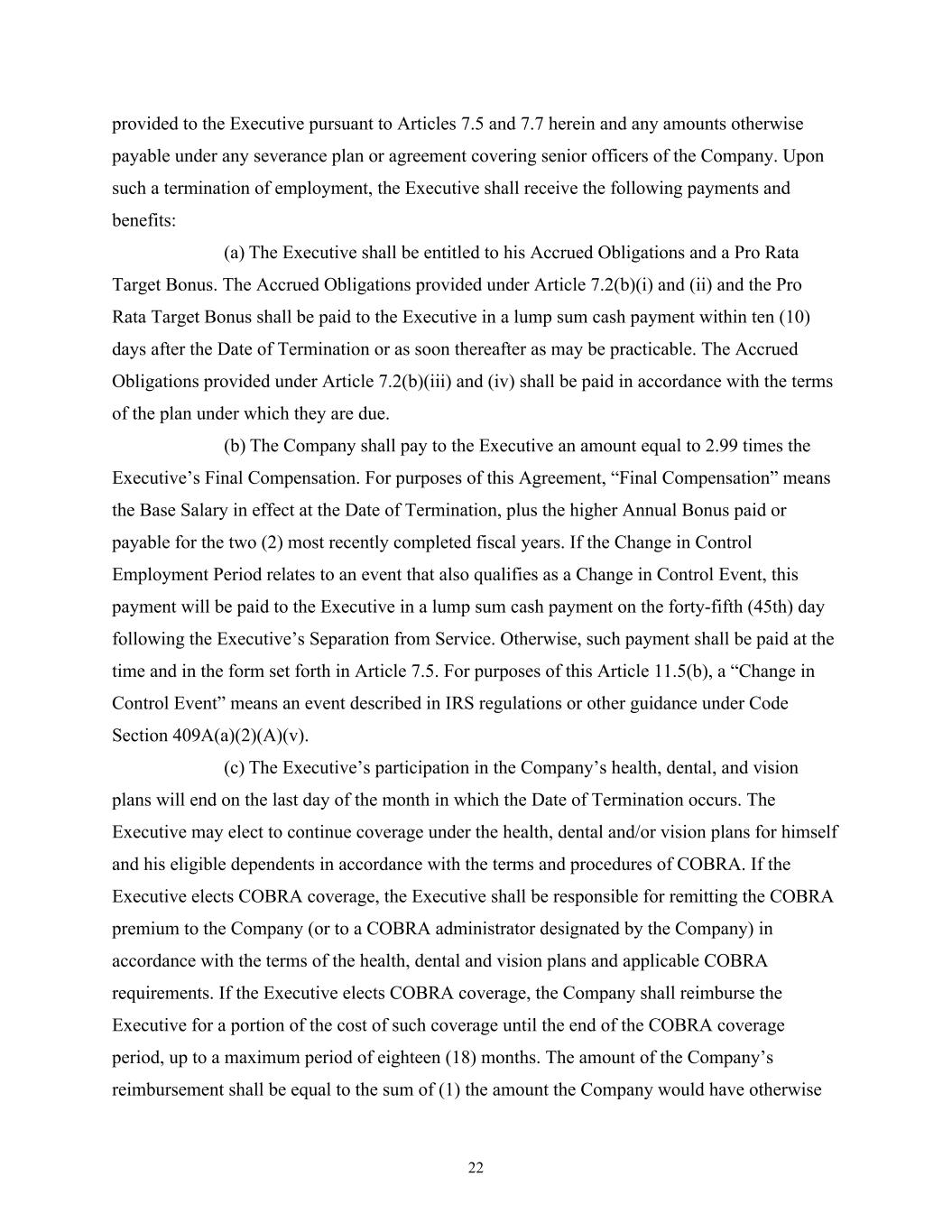 22 provided to the Executive pursuant to Articles 7.5 and 7.7 herein and any amounts otherwise payable under any severance plan or agreement covering senior officers of the Company. Upon such a termination of employment, the Executive shall receive the following payments and benefits: (a) The Executive shall be entitled to his Accrued Obligations and a Pro Rata Target Bonus. The Accrued Obligations provided under Article 7.2(b)(i) and (ii) and the Pro Rata Target Bonus shall be paid to the Executive in a lump sum cash payment within ten (10) days after the Date of Termination or as soon thereafter as may be practicable. The Accrued Obligations provided under Article 7.2(b)(iii) and (iv) shall be paid in accordance with the terms of the plan under which they are due. (b) The Company shall pay to the Executive an amount equal to 2.99 times the Executive’s Final Compensation. For purposes of this Agreement, “Final Compensation” means the Base Salary in effect at the Date of Termination, plus the higher Annual Bonus paid or payable for the two (2) most recently completed fiscal years. If the Change in Control Employment Period relates to an event that also qualifies as a Change in Control Event, this payment will be paid to the Executive in a lump sum cash payment on the forty-fifth (45th) day following the Executive’s Separation from Service. Otherwise, such payment shall be paid at the time and in the form set forth in Article 7.5. For purposes of this Article 11.5(b), a “Change in Control Event” means an event described in IRS regulations or other guidance under Code Section 409A(a)(2)(A)(v). (c) The Executive’s participation in the Company’s health, dental, and vision plans will end on the last day of the month in which the Date of Termination occurs. The Executive may elect to continue coverage under the health, dental and/or vision plans for himself and his eligible dependents in accordance with the terms and procedures of COBRA. If the Executive elects COBRA coverage, the Executive shall be responsible for remitting the COBRA premium to the Company (or to a COBRA administrator designated by the Company) in accordance with the terms of the health, dental and vision plans and applicable COBRA requirements. If the Executive elects COBRA coverage, the Company shall reimburse the Executive for a portion of the cost of such coverage until the end of the COBRA coverage period, up to a maximum period of eighteen (18) months. The amount of the Company’s reimbursement shall be equal to the sum of (1) the amount the Company would have otherwise
