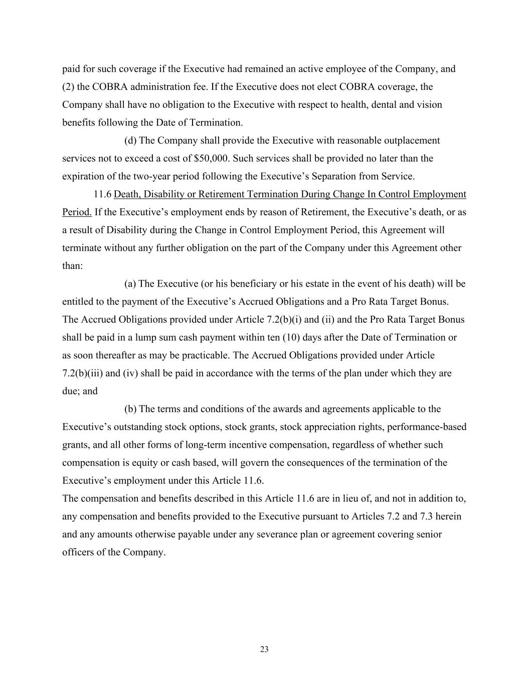 23 paid for such coverage if the Executive had remained an active employee of the Company, and (2) the COBRA administration fee. If the Executive does not elect COBRA coverage, the Company shall have no obligation to the Executive with respect to health, dental and vision benefits following the Date of Termination. (d) The Company shall provide the Executive with reasonable outplacement services not to exceed a cost of $50,000. Such services shall be provided no later than the expiration of the two-year period following the Executive’s Separation from Service. 11.6 Death, Disability or Retirement Termination During Change In Control Employment Period. If the Executive’s employment ends by reason of Retirement, the Executive’s death, or as a result of Disability during the Change in Control Employment Period, this Agreement will terminate without any further obligation on the part of the Company under this Agreement other than: (a) The Executive (or his beneficiary or his estate in the event of his death) will be entitled to the payment of the Executive’s Accrued Obligations and a Pro Rata Target Bonus. The Accrued Obligations provided under Article 7.2(b)(i) and (ii) and the Pro Rata Target Bonus shall be paid in a lump sum cash payment within ten (10) days after the Date of Termination or as soon thereafter as may be practicable. The Accrued Obligations provided under Article 7.2(b)(iii) and (iv) shall be paid in accordance with the terms of the plan under which they are due; and (b) The terms and conditions of the awards and agreements applicable to the Executive’s outstanding stock options, stock grants, stock appreciation rights, performance-based grants, and all other forms of long-term incentive compensation, regardless of whether such compensation is equity or cash based, will govern the consequences of the termination of the Executive’s employment under this Article 11.6. The compensation and benefits described in this Article 11.6 are in lieu of, and not in addition to, any compensation and benefits provided to the Executive pursuant to Articles 7.2 and 7.3 herein and any amounts otherwise payable under any severance plan or agreement covering senior officers of the Company.