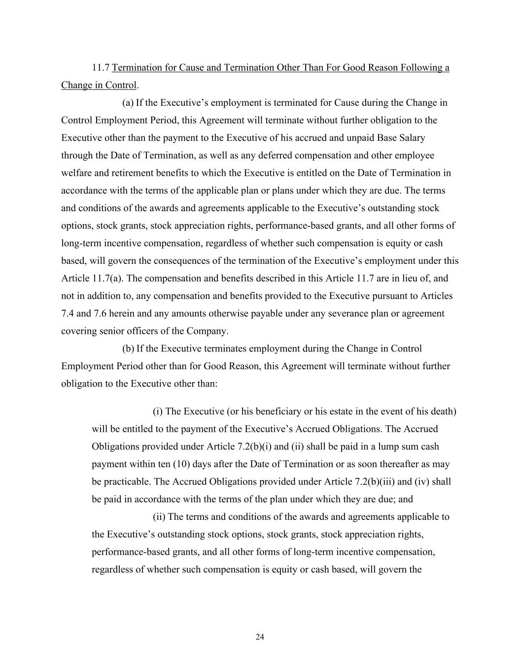 24 11.7 Termination for Cause and Termination Other Than For Good Reason Following a Change in Control. (a) If the Executive’s employment is terminated for Cause during the Change in Control Employment Period, this Agreement will terminate without further obligation to the Executive other than the payment to the Executive of his accrued and unpaid Base Salary through the Date of Termination, as well as any deferred compensation and other employee welfare and retirement benefits to which the Executive is entitled on the Date of Termination in accordance with the terms of the applicable plan or plans under which they are due. The terms and conditions of the awards and agreements applicable to the Executive’s outstanding stock options, stock grants, stock appreciation rights, performance-based grants, and all other forms of long-term incentive compensation, regardless of whether such compensation is equity or cash based, will govern the consequences of the termination of the Executive’s employment under this Article 11.7(a). The compensation and benefits described in this Article 11.7 are in lieu of, and not in addition to, any compensation and benefits provided to the Executive pursuant to Articles 7.4 and 7.6 herein and any amounts otherwise payable under any severance plan or agreement covering senior officers of the Company. (b) If the Executive terminates employment during the Change in Control Employment Period other than for Good Reason, this Agreement will terminate without further obligation to the Executive other than: (i) The Executive (or his beneficiary or his estate in the event of his death) will be entitled to the payment of the Executive’s Accrued Obligations. The Accrued Obligations provided under Article 7.2(b)(i) and (ii) shall be paid in a lump sum cash payment within ten (10) days after the Date of Termination or as soon thereafter as may be practicable. The Accrued Obligations provided under Article 7.2(b)(iii) and (iv) shall be paid in accordance with the terms of the plan under which they are due; and (ii) The terms and conditions of the awards and agreements applicable to the Executive’s outstanding stock options, stock grants, stock appreciation rights, performance-based grants, and all other forms of long-term incentive compensation, regardless of whether such compensation is equity or cash based, will govern the