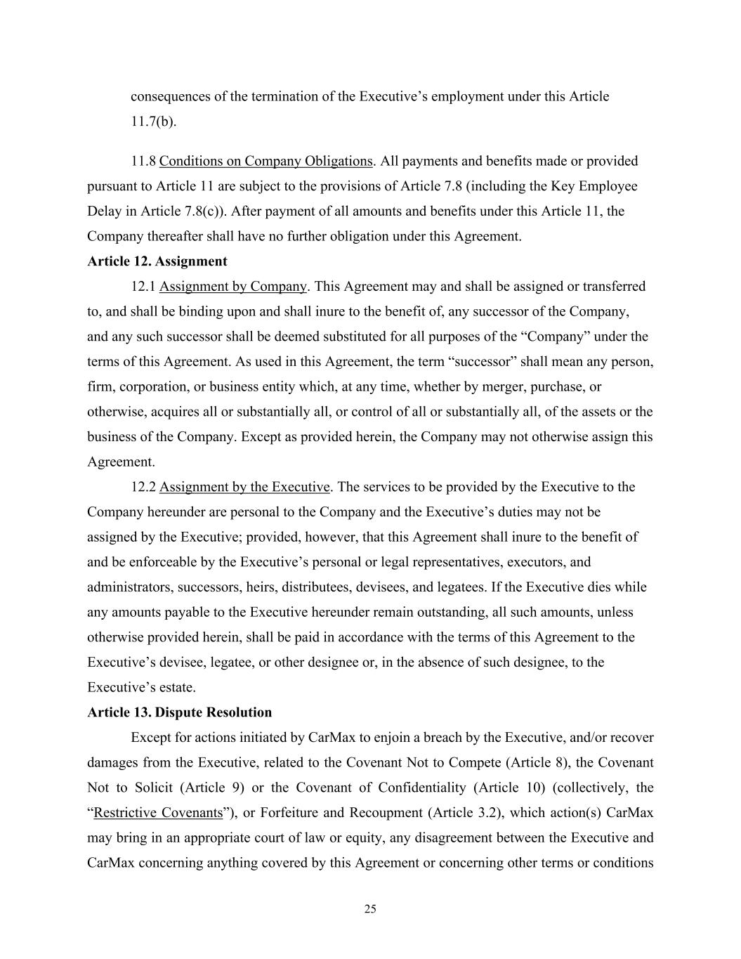 25 consequences of the termination of the Executive’s employment under this Article 11.7(b). 11.8 Conditions on Company Obligations. All payments and benefits made or provided pursuant to Article 11 are subject to the provisions of Article 7.8 (including the Key Employee Delay in Article 7.8(c)). After payment of all amounts and benefits under this Article 11, the Company thereafter shall have no further obligation under this Agreement. Article 12. Assignment 12.1 Assignment by Company. This Agreement may and shall be assigned or transferred to, and shall be binding upon and shall inure to the benefit of, any successor of the Company, and any such successor shall be deemed substituted for all purposes of the “Company” under the terms of this Agreement. As used in this Agreement, the term “successor” shall mean any person, firm, corporation, or business entity which, at any time, whether by merger, purchase, or otherwise, acquires all or substantially all, or control of all or substantially all, of the assets or the business of the Company. Except as provided herein, the Company may not otherwise assign this Agreement. 12.2 Assignment by the Executive. The services to be provided by the Executive to the Company hereunder are personal to the Company and the Executive’s duties may not be assigned by the Executive; provided, however, that this Agreement shall inure to the benefit of and be enforceable by the Executive’s personal or legal representatives, executors, and administrators, successors, heirs, distributees, devisees, and legatees. If the Executive dies while any amounts payable to the Executive hereunder remain outstanding, all such amounts, unless otherwise provided herein, shall be paid in accordance with the terms of this Agreement to the Executive’s devisee, legatee, or other designee or, in the absence of such designee, to the Executive’s estate. Article 13. Dispute Resolution Except for actions initiated by CarMax to enjoin a breach by the Executive, and/or recover damages from the Executive, related to the Covenant Not to Compete (Article 8), the Covenant Not to Solicit (Article 9) or the Covenant of Confidentiality (Article 10) (collectively, the “Restrictive Covenants”), or Forfeiture and Recoupment (Article 3.2), which action(s) CarMax may bring in an appropriate court of law or equity, any disagreement between the Executive and CarMax concerning anything covered by this Agreement or concerning other terms or conditions