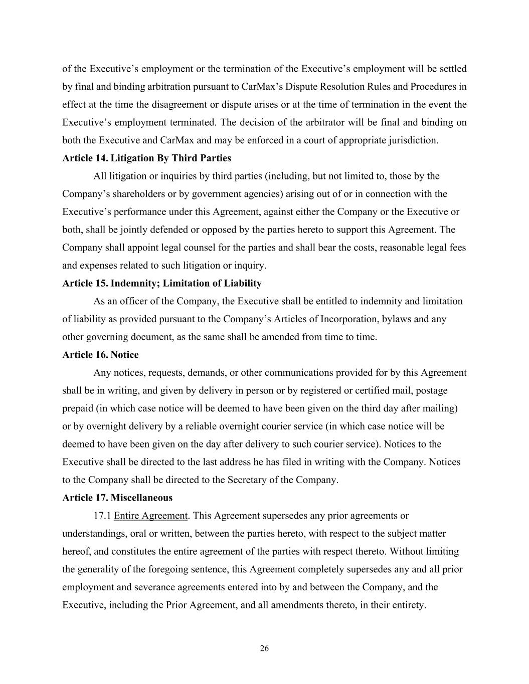 26 of the Executive’s employment or the termination of the Executive’s employment will be settled by final and binding arbitration pursuant to CarMax’s Dispute Resolution Rules and Procedures in effect at the time the disagreement or dispute arises or at the time of termination in the event the Executive’s employment terminated. The decision of the arbitrator will be final and binding on both the Executive and CarMax and may be enforced in a court of appropriate jurisdiction. Article 14. Litigation By Third Parties All litigation or inquiries by third parties (including, but not limited to, those by the Company’s shareholders or by government agencies) arising out of or in connection with the Executive’s performance under this Agreement, against either the Company or the Executive or both, shall be jointly defended or opposed by the parties hereto to support this Agreement. The Company shall appoint legal counsel for the parties and shall bear the costs, reasonable legal fees and expenses related to such litigation or inquiry. Article 15. Indemnity; Limitation of Liability As an officer of the Company, the Executive shall be entitled to indemnity and limitation of liability as provided pursuant to the Company’s Articles of Incorporation, bylaws and any other governing document, as the same shall be amended from time to time. Article 16. Notice Any notices, requests, demands, or other communications provided for by this Agreement shall be in writing, and given by delivery in person or by registered or certified mail, postage prepaid (in which case notice will be deemed to have been given on the third day after mailing) or by overnight delivery by a reliable overnight courier service (in which case notice will be deemed to have been given on the day after delivery to such courier service). Notices to the Executive shall be directed to the last address he has filed in writing with the Company. Notices to the Company shall be directed to the Secretary of the Company. Article 17. Miscellaneous 17.1 Entire Agreement. This Agreement supersedes any prior agreements or understandings, oral or written, between the parties hereto, with respect to the subject matter hereof, and constitutes the entire agreement of the parties with respect thereto. Without limiting the generality of the foregoing sentence, this Agreement completely supersedes any and all prior employment and severance agreements entered into by and between the Company, and the Executive, including the Prior Agreement, and all amendments thereto, in their entirety.