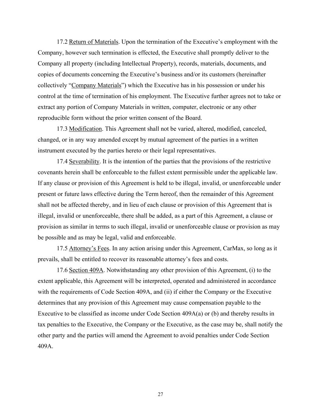27 17.2 Return of Materials. Upon the termination of the Executive’s employment with the Company, however such termination is effected, the Executive shall promptly deliver to the Company all property (including Intellectual Property), records, materials, documents, and copies of documents concerning the Executive’s business and/or its customers (hereinafter collectively “Company Materials”) which the Executive has in his possession or under his control at the time of termination of his employment. The Executive further agrees not to take or extract any portion of Company Materials in written, computer, electronic or any other reproducible form without the prior written consent of the Board. 17.3 Modification. This Agreement shall not be varied, altered, modified, canceled, changed, or in any way amended except by mutual agreement of the parties in a written instrument executed by the parties hereto or their legal representatives. 17.4 Severability. It is the intention of the parties that the provisions of the restrictive covenants herein shall be enforceable to the fullest extent permissible under the applicable law. If any clause or provision of this Agreement is held to be illegal, invalid, or unenforceable under present or future laws effective during the Term hereof, then the remainder of this Agreement shall not be affected thereby, and in lieu of each clause or provision of this Agreement that is illegal, invalid or unenforceable, there shall be added, as a part of this Agreement, a clause or provision as similar in terms to such illegal, invalid or unenforceable clause or provision as may be possible and as may be legal, valid and enforceable. 17.5 Attorney’s Fees. In any action arising under this Agreement, CarMax, so long as it prevails, shall be entitled to recover its reasonable attorney’s fees and costs. 17.6 Section 409A. Notwithstanding any other provision of this Agreement, (i) to the extent applicable, this Agreement will be interpreted, operated and administered in accordance with the requirements of Code Section 409A, and (ii) if either the Company or the Executive determines that any provision of this Agreement may cause compensation payable to the Executive to be classified as income under Code Section 409A(a) or (b) and thereby results in tax penalties to the Executive, the Company or the Executive, as the case may be, shall notify the other party and the parties will amend the Agreement to avoid penalties under Code Section 409A.