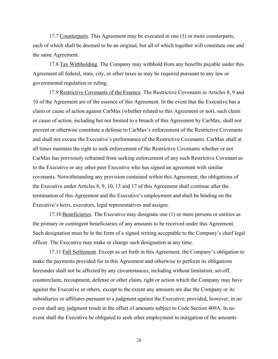 28 17.7 Counterparts. This Agreement may be executed in one (1) or more counterparts, each of which shall be deemed to be an original, but all of which together will constitute one and the same Agreement. 17.8 Tax Withholding. The Company may withhold from any benefits payable under this Agreement all federal, state, city, or other taxes as may be required pursuant to any law or governmental regulation or ruling. 17.9 Restrictive Covenants of the Essence. The Restrictive Covenants in Articles 8, 9 and 10 of the Agreement are of the essence of this Agreement. In the event that the Executive has a claim or cause of action against CarMax (whether related to this Agreement or not), such claim or cause of action, including but not limited to a breach of this Agreement by CarMax, shall not prevent or otherwise constitute a defense to CarMax’s enforcement of the Restrictive Covenants and shall not excuse the Executive’s performance of the Restrictive Covenants. CarMax shall at all times maintain the right to seek enforcement of the Restrictive Covenants whether or not CarMax has previously refrained from seeking enforcement of any such Restrictive Covenant as to the Executive or any other peer Executive who has signed an agreement with similar covenants. Notwithstanding any provision contained within this Agreement, the obligations of the Executive under Articles 8, 9, 10, 13 and 17 of this Agreement shall continue after the termination of this Agreement and the Executive’s employment and shall be binding on the Executive’s heirs, executors, legal representatives and assigns. 17.10 Beneficiaries. The Executive may designate one (1) or more persons or entities as the primary or contingent beneficiaries of any amounts to be received under this Agreement. Such designation must be in the form of a signed writing acceptable to the Company’s chief legal officer. The Executive may make or change such designation at any time. 17.11 Full Settlement. Except as set forth in this Agreement, the Company’s obligation to make the payments provided for in this Agreement and otherwise to perform its obligations hereunder shall not be affected by any circumstances, including without limitation, set-off, counterclaim, recoupment, defense or other claim, right or action which the Company may have against the Executive or others, except to the extent any amounts are due the Company or its subsidiaries or affiliates pursuant to a judgment against the Executive; provided, however, in no event shall any judgment result in the offset of amounts subject to Code Section 409A. In no event shall the Executive be obligated to seek other employment in mitigation of the amounts